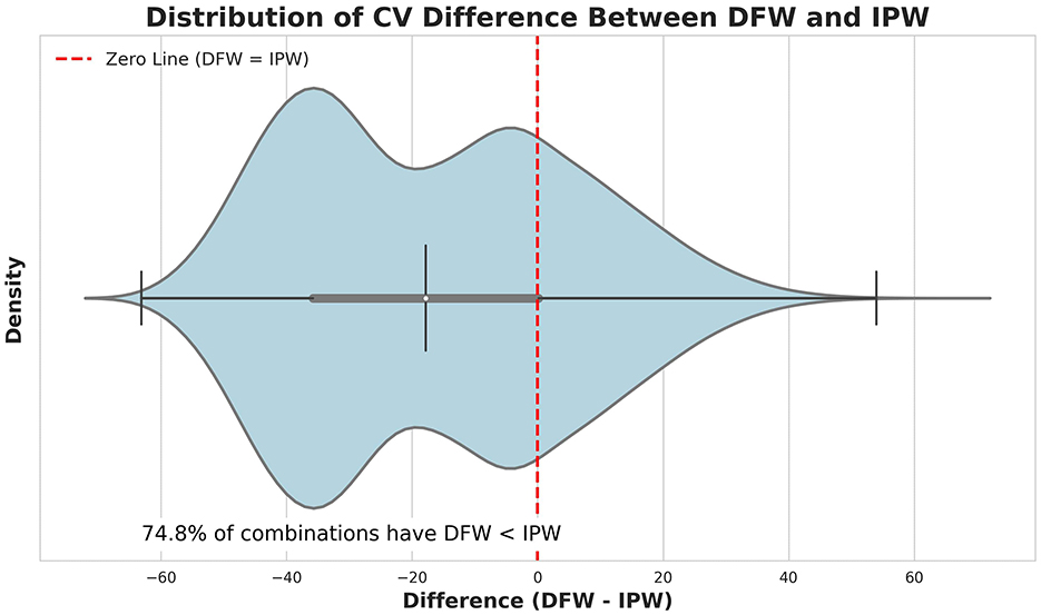 Figure 1. Distribution of CV the differences between the DFW and inverse probability weighting (IPW) calculated across all samples. The violin+box plot shows the density of differences, with a red dashed line indicating where the CVs are equal (DFW = IPW). The annotation indicates that 74.8% of the combinations have CV of DFW < IPW, highlighting the intrinsic ability of DFW in maintaining low variance in weights.