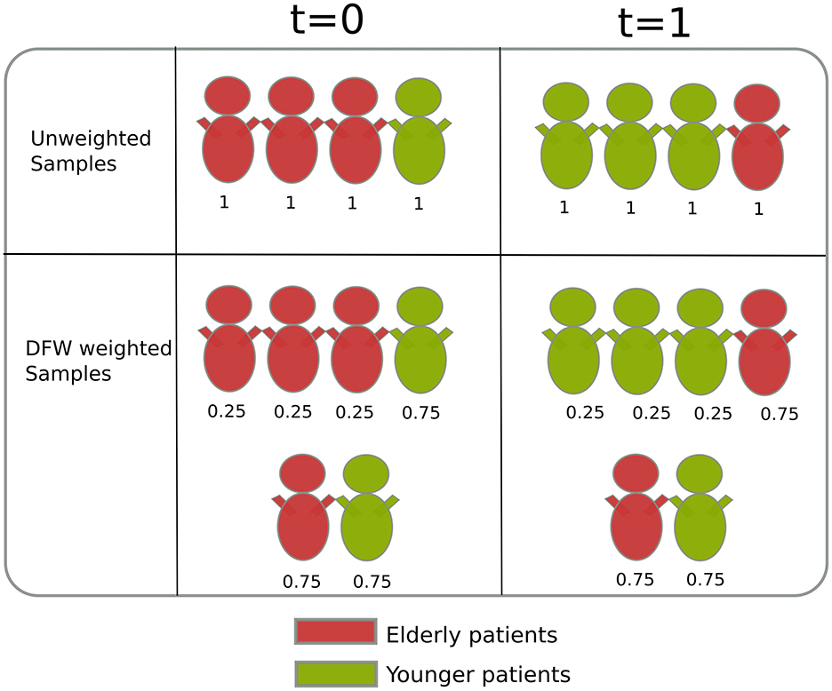 Figure 2. The figure shows two treatment groups (t = 0 and t = 1) with an imbalanced age distribution—a key confounder. DFW corrects this by weighting samples: 1-the probability of receiving the observed treatment. For instance, in the t = 0 group, elderly patients (red) (75% probability) are assigned a weight of 0.25 while younger patients (green) (25% probability) receive 0.75; the pattern reverses in the t = 1 group. This process yields a balanced pseudo-population akin to an RCT, enabling unbiased causal inference by making age distribution equal in both treatment groups.
