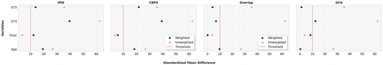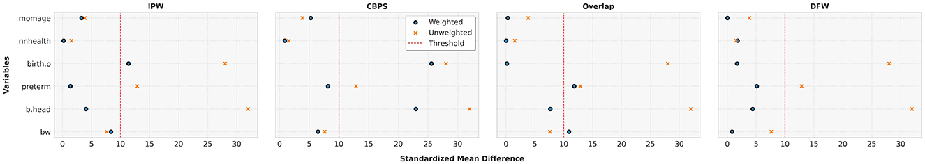 The left panel of Figure 3 shows that Inverse Probability Weighting (IPW) reduces SMD below the 10 threshold for some variables, improving upon the unweighted case. The middle panel illustrates the performance of Covariate Balancing Propensity Score (CBPS), which struggles to balance certain covariates. The Overlap weighting method, shown alongside, performs well on IHDP, with only two covariates exceeding the threshold, indicating effective covariate balance. Finally, the right panel demonstrates that our DFW approach achieves the strongest covariate balance—SMD values are consistently below 10, with most under 5—outperforming all baselines.
