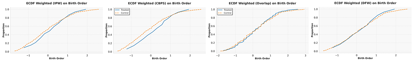 Figure 5 presents empirical cumulative distribution function (ECDF) plots for the birth order covariate in the IHDP dataset under different weighting schemes. The first three panels illustrate that the treated (blue) and control (orange) groups exhibit significantly different distributions when weighted using IPW, CBPS, and Overlap, respectively. In contrast, the last panel–based on our DFW weighting scheme–shows near-identical distributions between treated and control groups, indicating superior covariate balance.