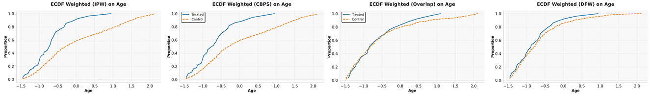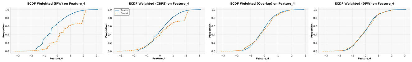 Figure 8 presents the ECDF plot of covariate 4 from the high selection bias synthetic dataset (selected due to space constraints). The results further reinforce our findings: IPW, CBPS, and Overlap struggle to align the distributions between treatment groups, whereas DFW effectively balances them, resulting in closely overlapping empirical distributions.