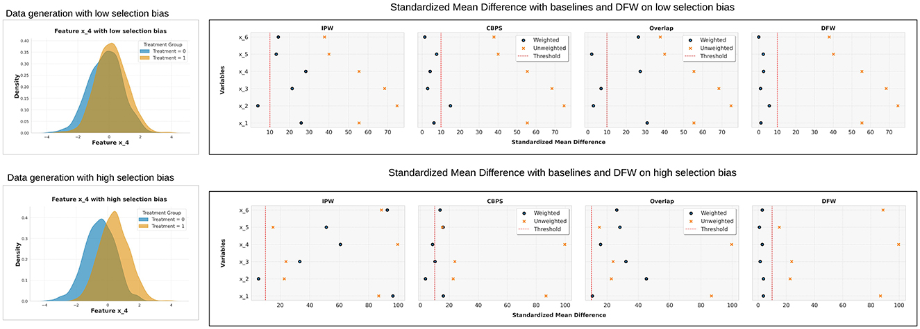 Figure 7. Absolute standardized mean difference (SMD) analysis on two synthetic datasets with varying levels of selection bias. The upper panel corresponds to a dataset with low selection bias, while the lower panel represents a high selection bias setting (visualized using covariate 4). As selection bias increases, the performance of IPW, CBPS, and Overlap weighting deteriorates, failing to consistently reduce SMD below the desired threshold. In contrast, our proposed DFW method remains robust, effectively controlling SMD values across both scenarios.