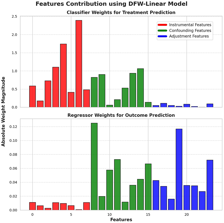 Figure 9. We validate our method on a synthetic dataset [18] where the feature roles are predefined: instrumental features influence only treatment assignment, confounding features affect both treatment assignment and outcome, and adjustment features impact only the outcome. For our weighting scheme to function as intended, the classifier should rely exclusively on instrumental and confounding features for propensity score estimation. More importantly, the regression model should leverage only confounding and adjustment features for outcome prediction using DFW weights. The figure confirms these expected patterns, demonstrating that our approach effectively separates feature contributions as intended.
