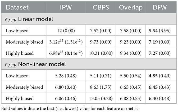 For non-linear models, a similar trend is observed, though the overall errors are more controlled across methods. DFW continues to outperform others, achieving the lowest ϵATE in all bias settings (4.85, 6.45, and 6.40). Overlap performs better than CBPS in moderate and high bias regimes (6.65 and 6.88 vs. 8.63 and 13.05), and remains close to DFW in low bias (5.50). While IPW does not suffer from the extreme numerical instability seen in the linear model, it still yields larger errors (5.28–6.86) compared to Overlap and DFW.
