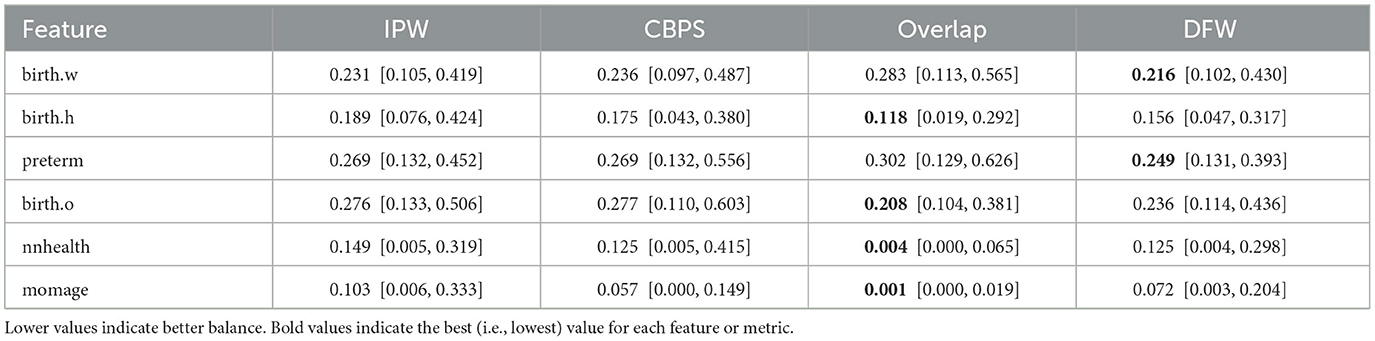 Across both datasets, DFW consistently provides strong balance performance with narrower or comparable confidence intervals, indicating both accuracy and robustness. These results highlight DFW's ability to achieve reliable covariate balance across diverse datasets and variable types, often outperforming or matching established methods such as IPW, CBPS, and Overlap weighting.