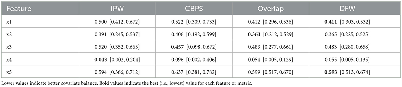 In the low bias setting, DFW consistently achieves the best covariate balance on five out of six features. For instance, on feature x5, DFW attains a K-S statistic of 0.191 [0.095, 0.290], compared to 0.313 for IPW and 0.223 for CBPS. Similarly, on x3 and x4, DFW's values of 0.271 and 0.231, respectively, are the lowest, with Overlap and CBPS slightly trailing behind. Only on x0 does CBPS slightly outperform DFW, with 0.274 [0.185, 0.381] vs. 0.280 [0.169, 0.357], although their confidence intervals largely overlap. These results suggest that all methods are relatively effective under mild bias, but DFW provides the most consistently low dispersion.