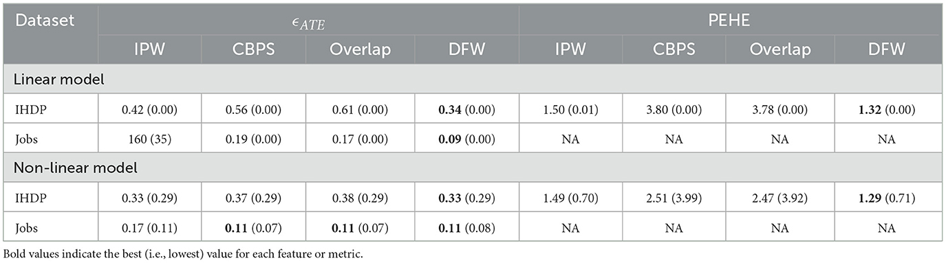 Table 4 presents the performance of four weighting methods—IPW, CBPS, Overlap, and DFW—on treatment effect estimation, evaluated using the mean absolute bias in average treatment effect (ϵATE) and Precision in Estimation of Heterogeneous Effect (PEHE). Results are reported for both linear and non-linear outcome models on the IHDP and Jobs datasets.