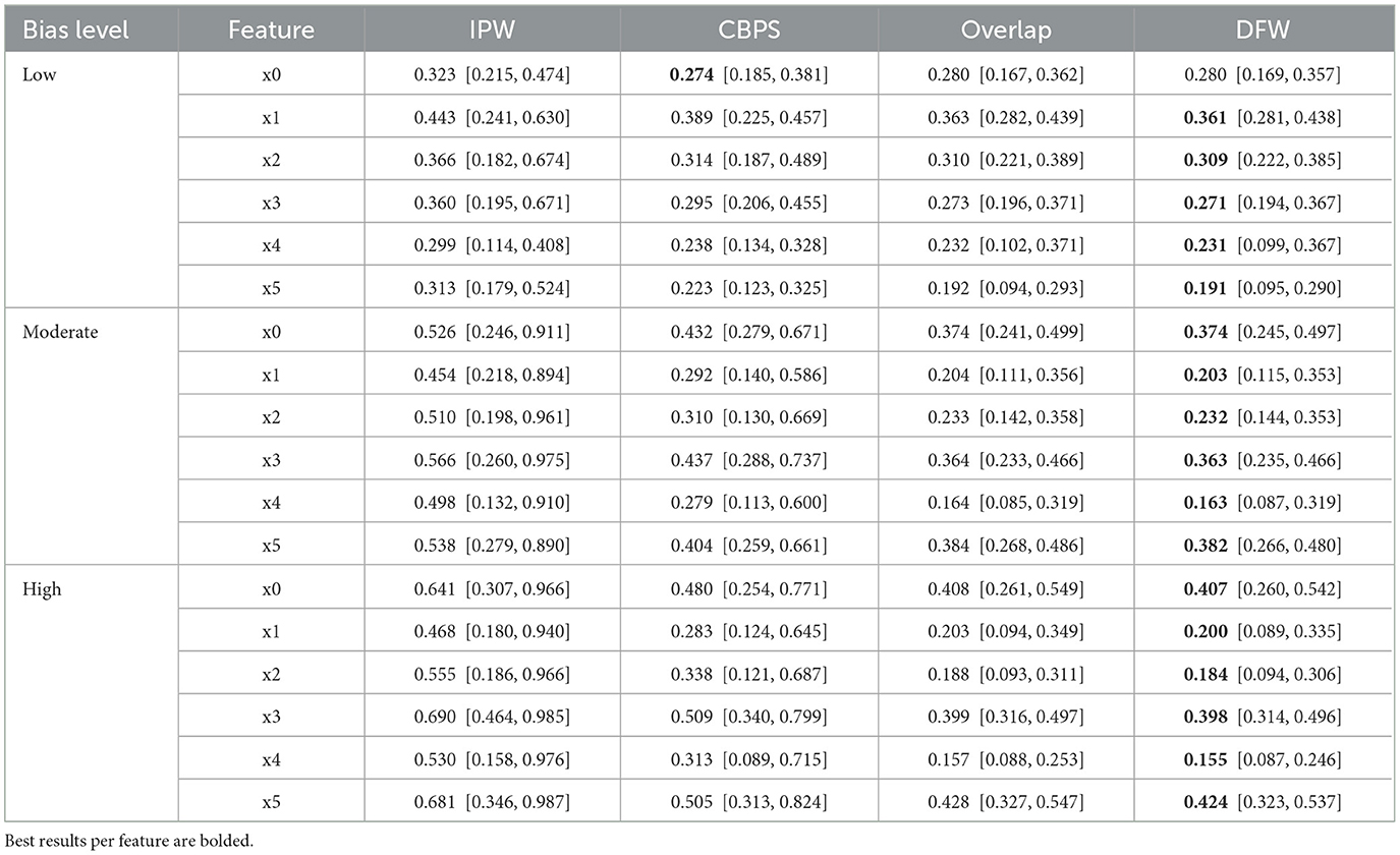 Overall, these results demonstrate that DFW provides superior covariate balance not only in low-bias conditions but especially under moderate and high selection bias. Its performance remains consistent across features and bias levels, suggesting its effectiveness in producing well-balanced samples for reliable treatment effect estimation.