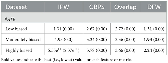 Table 1 presents the mean absolute bias in average treatment effect (ϵATE) across synthetic datasets with varying levels of selection bias. Lower values indicate more accurate estimation. In the low-bias setting, DFW outperforms all other methods, achieving the lowest error (5.54), while Overlap and CBPS yield similar results (7.58 and 7.52, respectively), both outperforming IPW (12).
