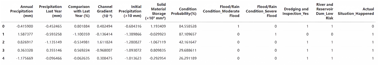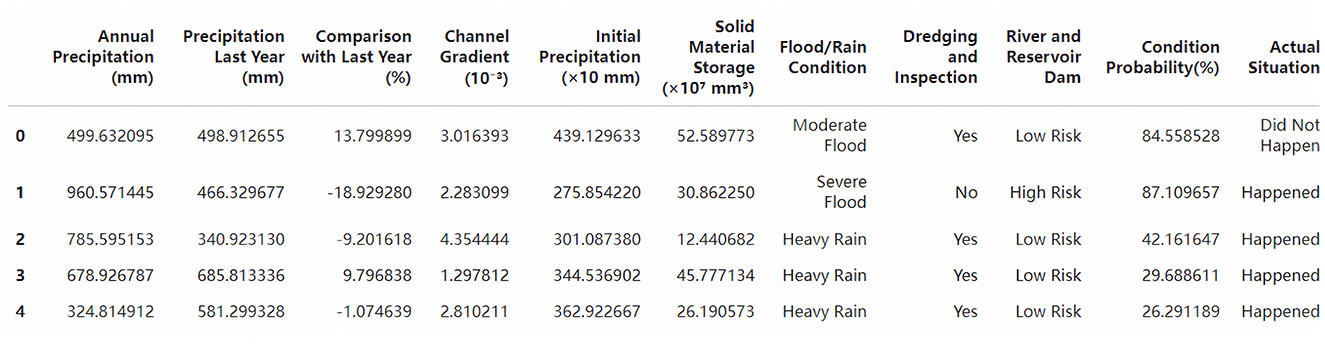 The dataset used in this study was collected from various hydrological monitoring stations across the Yellow River basin, covering the period from 2001 to 2023. It consists of ~10,000 records that include daily measurements of variables such as annual precipitation, precipitation compared to the previous year, river channel gradient, initial precipitation, sediment storage, flood conditions, dredging activities, risk assessment indicators for rivers and dams, and actual flood occurrence status. These data provide rich information for model training and lay a solid foundation for model evaluation and validation. The selection and consideration of data are based on data availability, quality, and multi-source data integration to ensure the improvement of model prediction performance. A snapshot of the original dataset is shown in Figure 3.