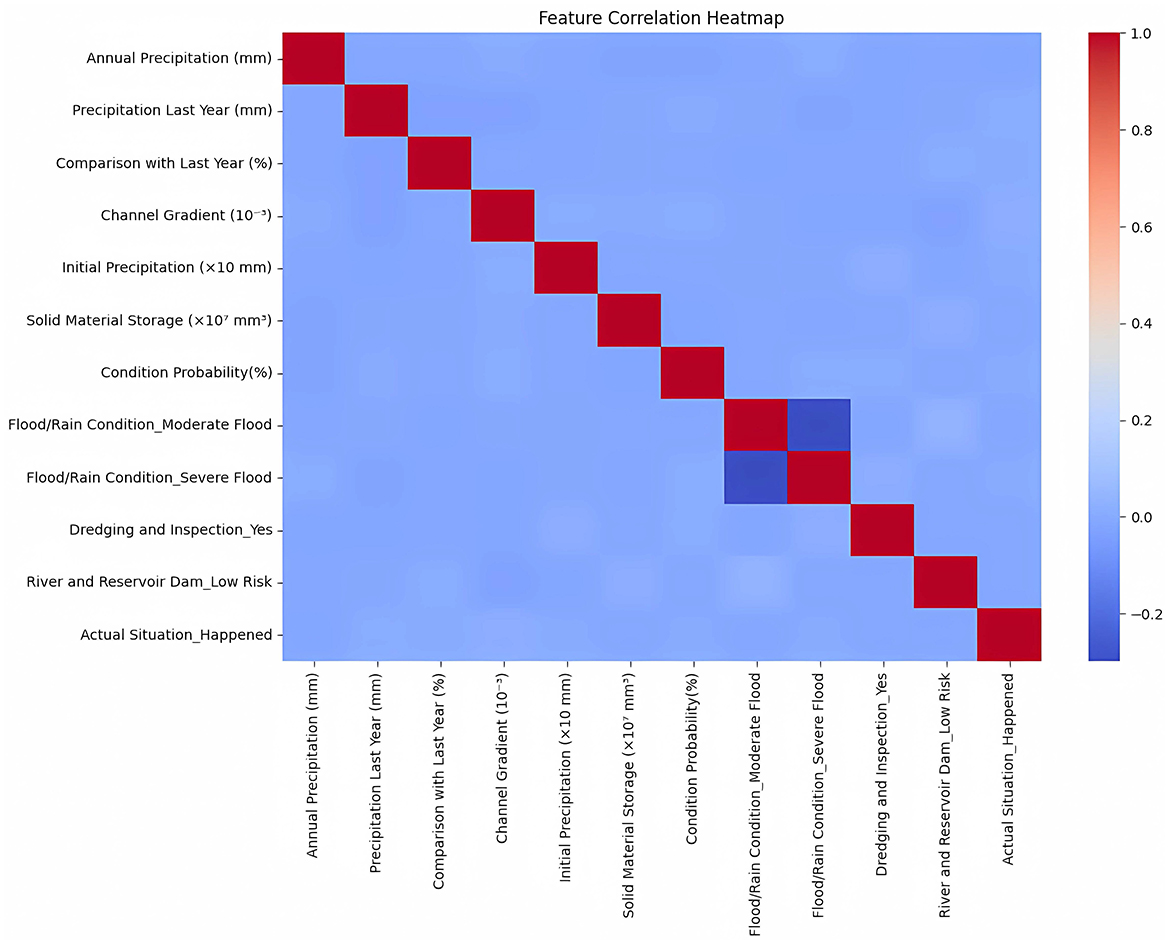 To optimize feature selection and enhance model efficiency, we analyzed feature correlations using a heatmap (Figure 5). The analysis revealed strong positive correlations, notably between annual precipitation and initial precipitation, and between condition probability and actual flood occurrence. Conversely, some negative correlations emerged, such as between severe flood conditions and actual flood occurrences, likely due to effective regional flood mitigation measures. Features such as channel gradient exhibited minimal correlation, suggesting indirect impacts on flood risk.