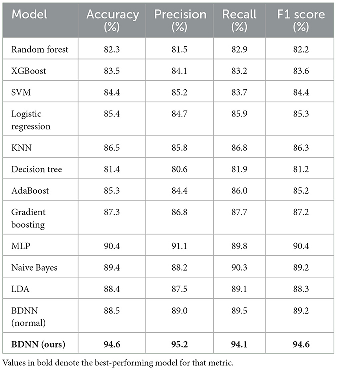 Figure 6. Performance comparison of BDNN against baseline models across multiple evaluation metrics.
