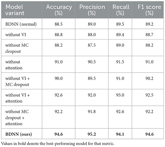 The ablation results indicated that each component significantly contributes to overall model performance. Removing the Hierarchical Attention Mechanism resulted in the most substantial performance decrease, with accuracy dropping by 4.6%, underscoring its critical role in effective feature selection and prediction accuracy enhancement. Similarly, the removal of VI and MC Dropout reduced accuracy by 2.4 and 2.0%, respectively, emphasizing their importance in improving generalization and reliability. When both VI and MC Dropout were removed simultaneously, accuracy further declined to 91.0%, highlighting the synergistic effects of these components in maintaining model stability and prediction reliability. Thus, our comprehensive BDNN model, integrating all modules, achieved optimal performance.