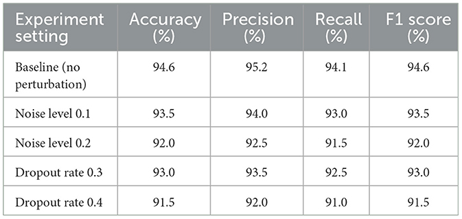 The robustness experiments showed that the model's accuracy slightly decreased to 93.5% when noise at a level of 0.1 was added, demonstrating strong resilience to minor data disturbances. Increasing the noise level further to 0.2 resulted in accuracy dropping to 92.0%, though performance remained relatively high. Similarly, adjustments to the dropout rate (0.3 and 0.4) resulted in accuracy levels of 93.0% and 91.5%, respectively, indicating the model's resilience to training randomness.