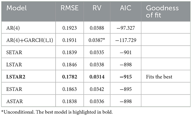 Comparing the fit of the chosen AR(4), AR(4)+GARCH(1,1), LSTAR, SETAR, LSTAR2, ESTAR, and ASTAR models using the root mean squared error loss (RMSE), (unconditional) residual variance (RV), and Akaike Information Criterion (AIC), LSTAR2 displays the best goodness-of-fit (Table 1). ASTAR is the second best according to RMSE.