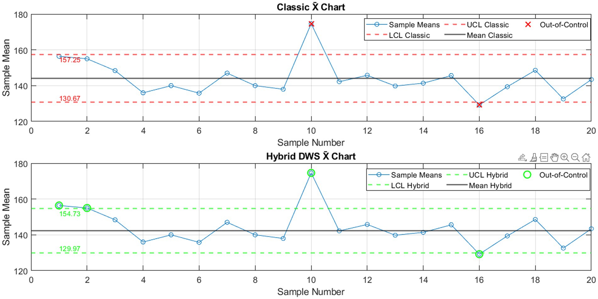 1. There were two out-of-control points in the classical X̄ chart: sample 10 and sample 16, out of 20 subgroups. The hybrid DWS-X̄ plot presented samples 1, 2, 10, and 16 as being out-of-control, thus being more sensitive at identifying out-of-control conditions.