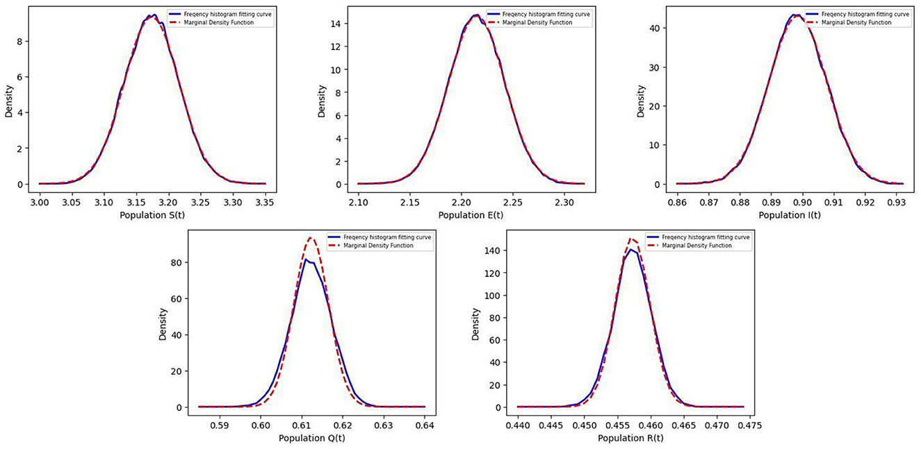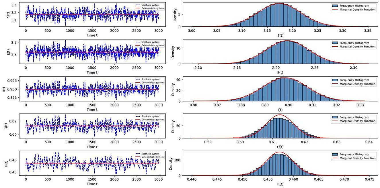 The dynamical behavior of the solutions is illustrated on the left-hand side of Figure 1, which shows that the disease exhibits significant persistence over time. The right-hand side of Figure 1 gives the frequency histogram and marginal density function of Equation 5, which indicates that the Equation 5 has a stationary distribution. Figure 2 presents the frequency fitted-density function and marginal density function for S(t), E(t), I(t), Q(t), and R(t). From Figure 2, it can be observed that the density function image is almost identical to the corresponding frequency histogram fitting curves, which demonstrates that the probability density function of the stationary distribution follows a Gaussian distribution.