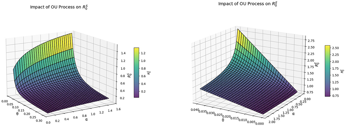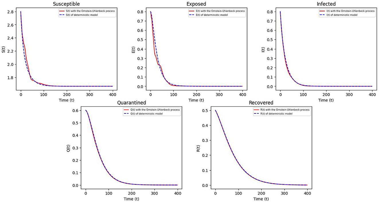 However, due to the inherent variability in real-world populations, viral transmission is subject to stochastic disturbances. Consequently, a growing body of research in infection dynamics focuses on the stochastic properties of dynamical systems. Stochastic epidemic models that incorporate environmental noise provide a more realistic representation of disease spread than traditional deterministic models [7]. For instance, Shi et al. [8] proposed a randomized COVID-19 SEIR model with an Ornstein-Uhlenbeck process, which contributes to our comprehension of the dynamic mechanisms. Su et al. [9] applied a randomized HBV infectious model having normal morbidity, cell-to-cell spread, and immunological reactions. The consequences of environmental perturbations on the mathematical model can be realized by revising the model's parameters. Two principal ways of changing the parameters are mentioned [10]. One approach is to pretend that the parameters are linear functions of Gaussian white noise. Liu et al. [11] developed an SEIR-based COVID-19 stochastic epidemic model incorporating independent standard Brownian motion to analyze transmission dynamics within infected populations. Shi et al. [12] developed a stochastic SEIRS rabies model incorporating population diffusion. The other option is to utilize the mean-reversion process to interfere with the parameters. Wei et al. [13] established the dynamic behavior of an HIV infection model featuring two transmission modes. Liu et al. [14] investigated a viral infectious disease model incorporating latent individuals and a log-OU process. Ornstein-Uhlenbeck process is notionally and biologically more relevant. It better characterizes environmental heterogeneity in biological systems than a linear function of white noise [15]. Thus, this study adopts the latter assumption. Since is biologically important as the rate of transmission between susceptible and exposed individuals, then we suppose that of Equation 2 varies arbitrarily due to environmental perturbations and it is amenable to the Ornstein–Uhlenbeck process. In this case, could be changed to the form below: