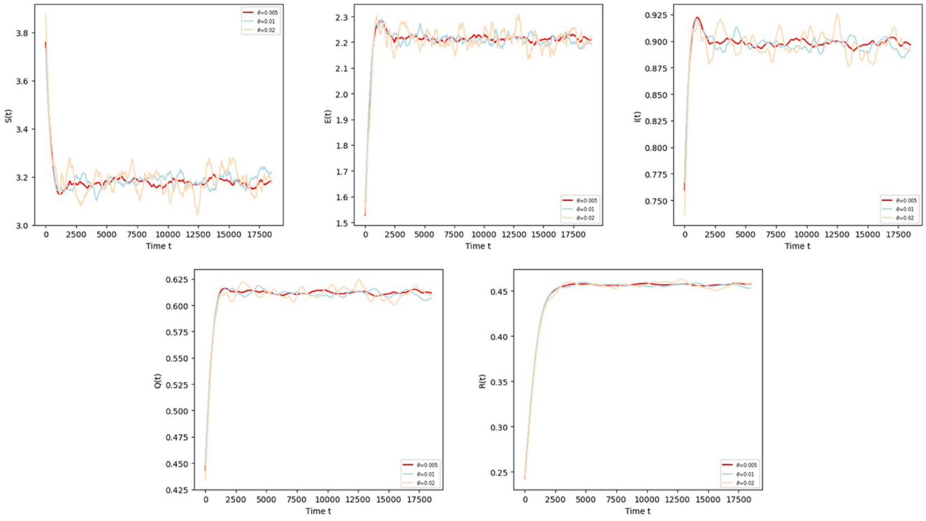 Figure 4. The trajectories of S(t), E(t), I(t), Q(t), R(t) in Equation 5 with different values for volatility intensity θ.