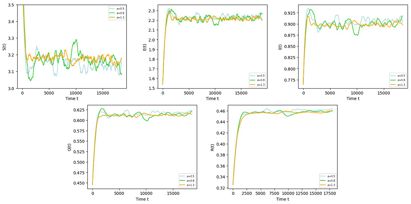 From the sample trajectories of S, E, I, Q, R in Figure 5, the larger α is, the smaller the vibration of the sample motion trajectory is, and the more stable the disease is.