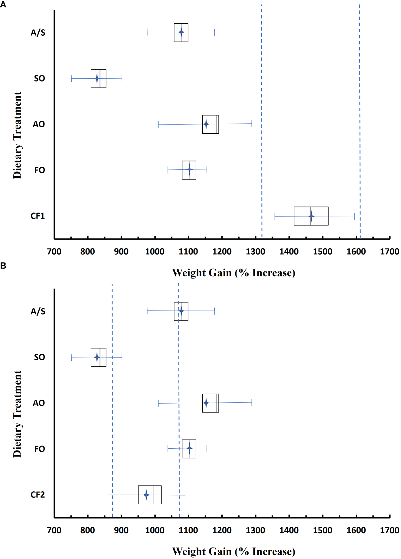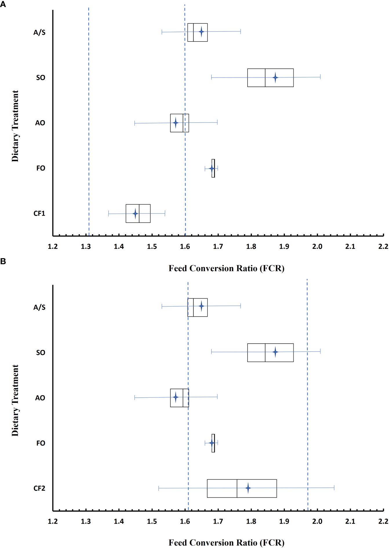 where θL and θU represent the lower and upper bounds of the equivalence interval of the two CF diets, respectively (Wachs, 2015). Under this scenario, the question is not if the diets are different, but if they are similar enough in their response (Ialongo, 2017) to evaluate their suitability relative to commercial diets that contain both FM and FO. This third objective should be viewed in the framework of empirical discovery for directing future studies (Kerr, 1998).