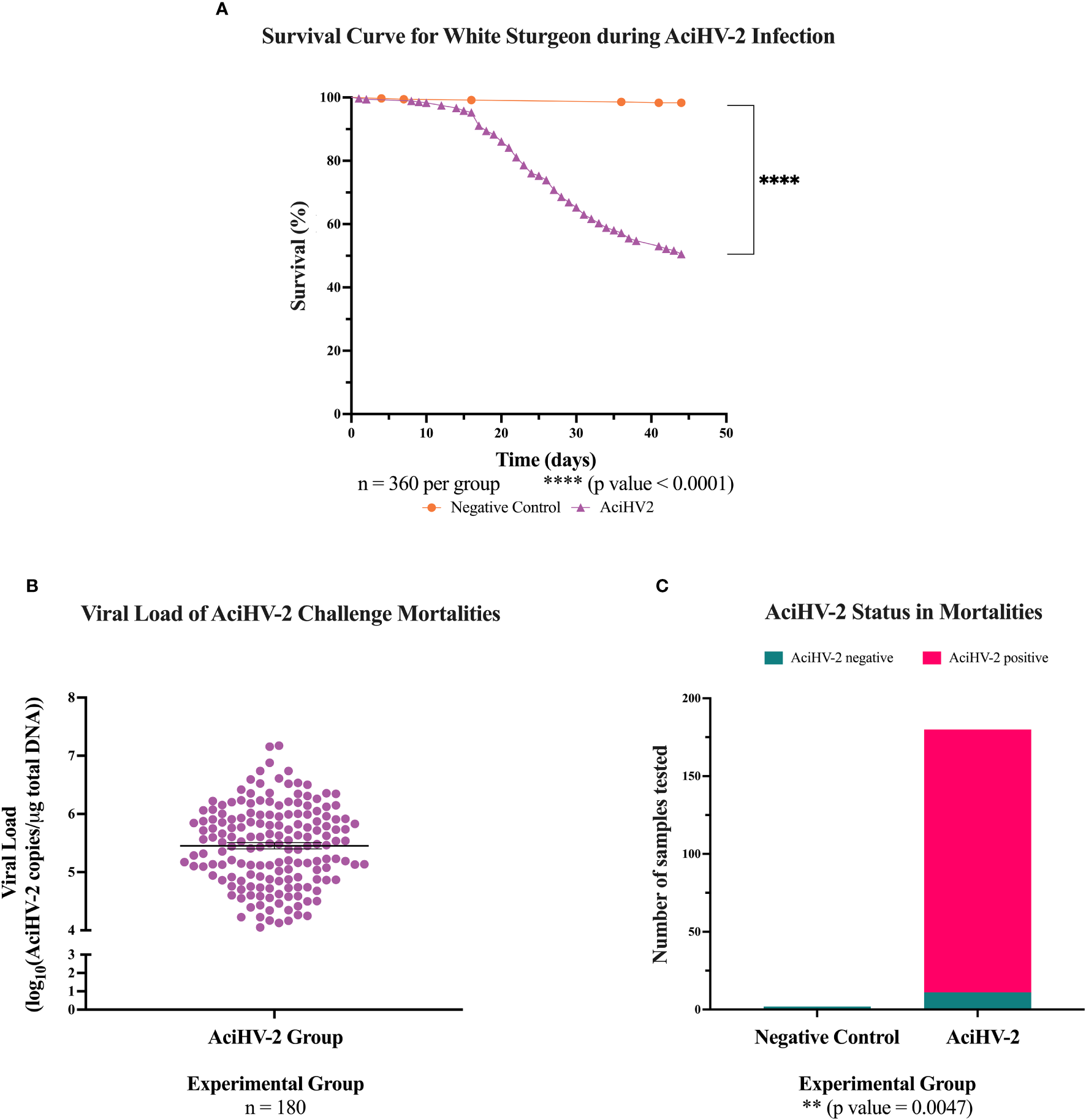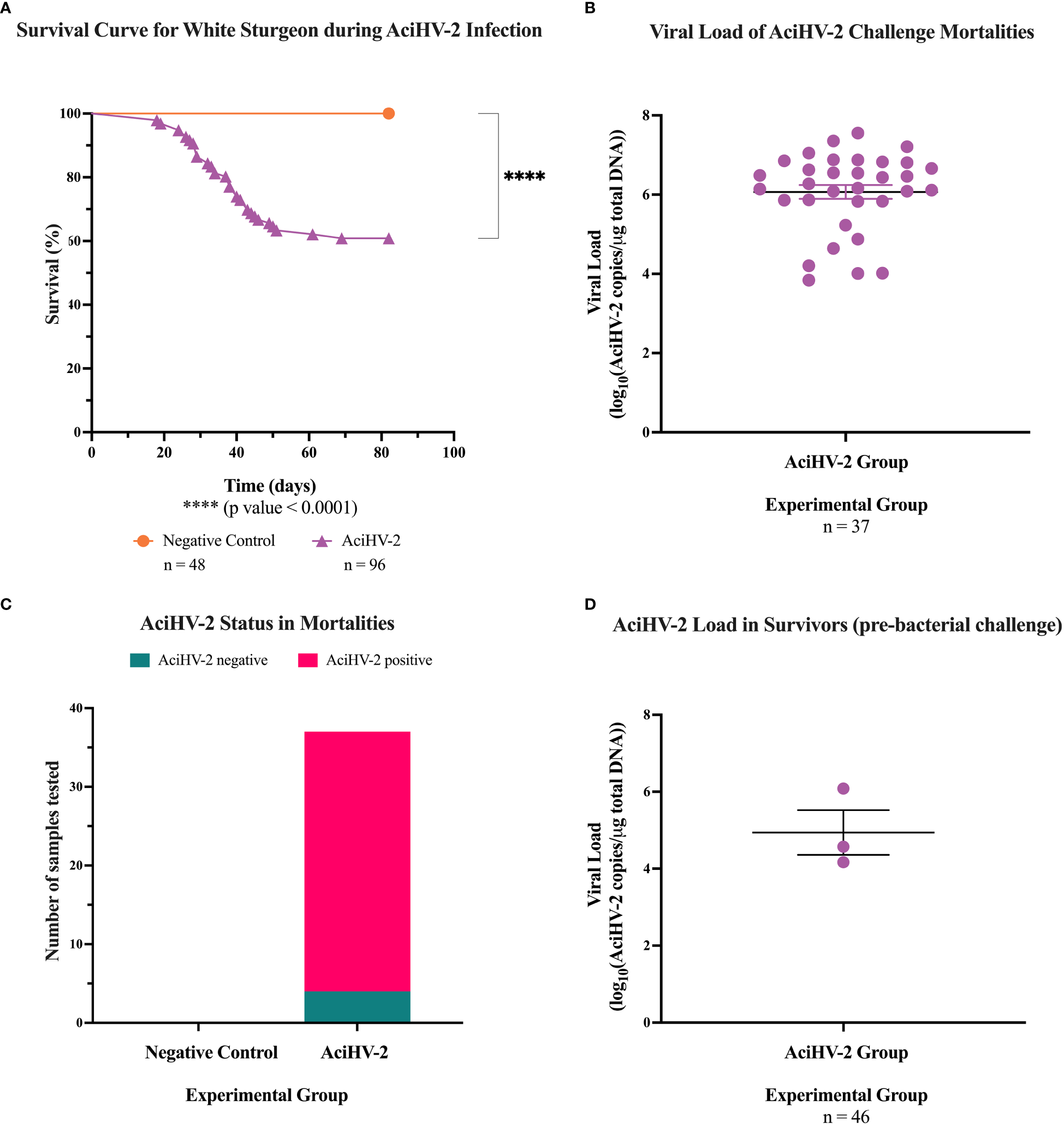 Acipenserid Herpesvirus 2 (AciHV-2) challenge during pilot challenge. A 1- hour static immersion challenge with 5.1x102 TCID50/mL) of Acipenserid Herpesvirus 2 (AciHV-2) was performed (n=96). A negative control group was treated similarly but sterile cell culture media was used instead of virus suspension (n=48). Mortality was monitored for 80 days and mortalities were tested for AciHV-2 via qPCR of pectoral fin DNA. Survivors were tested for AciHV-2 via quantitative polymerase chain reaction (qPCR) of DNA extracted from the pectoral fin of each fish. (A) The solid shapes represent the mean cumulative mortality at each day. The different experimental groups are color-coded. A statistically significant reduction in survival is seen in the AciHV-2 exposed group when compared with the negative control group. (B) The solid dots represent the mean viral load of sampled mortalities, with the standard error of the mean plotted. Four mortalities in the AciHV-2 group had undetermined Ct values and are not displayed in this graph. The mean viral load among mortalities was 106 copies/ug total DNA. (C) The bars represent the number of samples tested for AciHV-2 via qPCR, color-coded by qPCR result. This shows that 89% of the mortalities in the AciHV-2 group tested positive for AciHV-2 via qPCR. (D) The solid dots represent the mean viral load of sampled survivors, with the standard error of the mean plotted. Only three individuals tested positive with a mean viral load of 104.9 copies/ug total DNA.