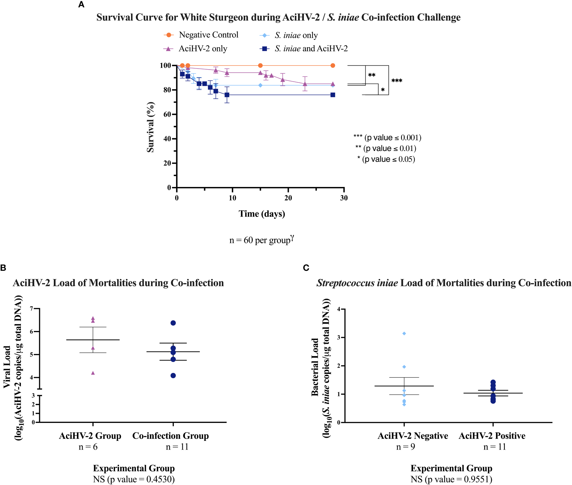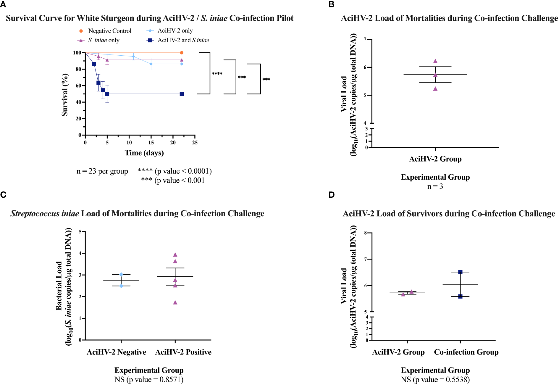 Acipenserid Herpesvirus 2 (AciHV-2) and Streptococcus iniae (S. iniae) co-infection large-scale challenge. An immersion challenge model was performed by exposing white sturgeon fingerlings to a 5.96x102 TCID50/mL AciHV-2 bath or a sterile cell culture media bath for 1 hour. Survivors of this challenge at 44 days were re-sorted into groups of 60 fish (triplicate tanks of 20 fish each) per treatment. Fish received either 106 CFU of S. iniae or sterile Phosphate Buffered Saline in the epaxial musculature. Mortality was monitored for 28 days after injection and mortalities tested for AciHV-2 and S. iniae via quantitative polymerase chain reaction (qPCR). (A) The solid shapes represent the mean cumulative mortality at each day, with standard error of the mean plotted. The different experimental groups are color coded. A statistically significant reduction in survival is seen in all infected groups when compared to the negative control, except for the AciHV-2 group. When comparing infected groups among themselves, the co-infection group has the lowest survival, showing a statistically significant reduction compared to the AciHV-2 group. (B) The solid dots represent the mean viral load of sampled mortalities, with the standard error of the mean plotted. There was no statistical difference in viral loads between groups. This also shows that 67% and 45% of the mortalities in the AciHV-2 and in the co-infection groups, respectively, tested positive for AciHV-2. There is a strong association between an AciHV-2 positive status and the experimental group (p value = 0.0027). (C) The solid dots represent the mean bacterial load of sampled mortalities, with the standard error of the mean plotted. There was no statistical difference in bacterial loads between groups. This also shows that 89% and 45% of the mortalities in the S. iniae and in the co-infection groups, respectively, tested positive for S. iniae. There is a strong association between an S. iniae positive status and the experimental group (p value ≤ 0.0001).