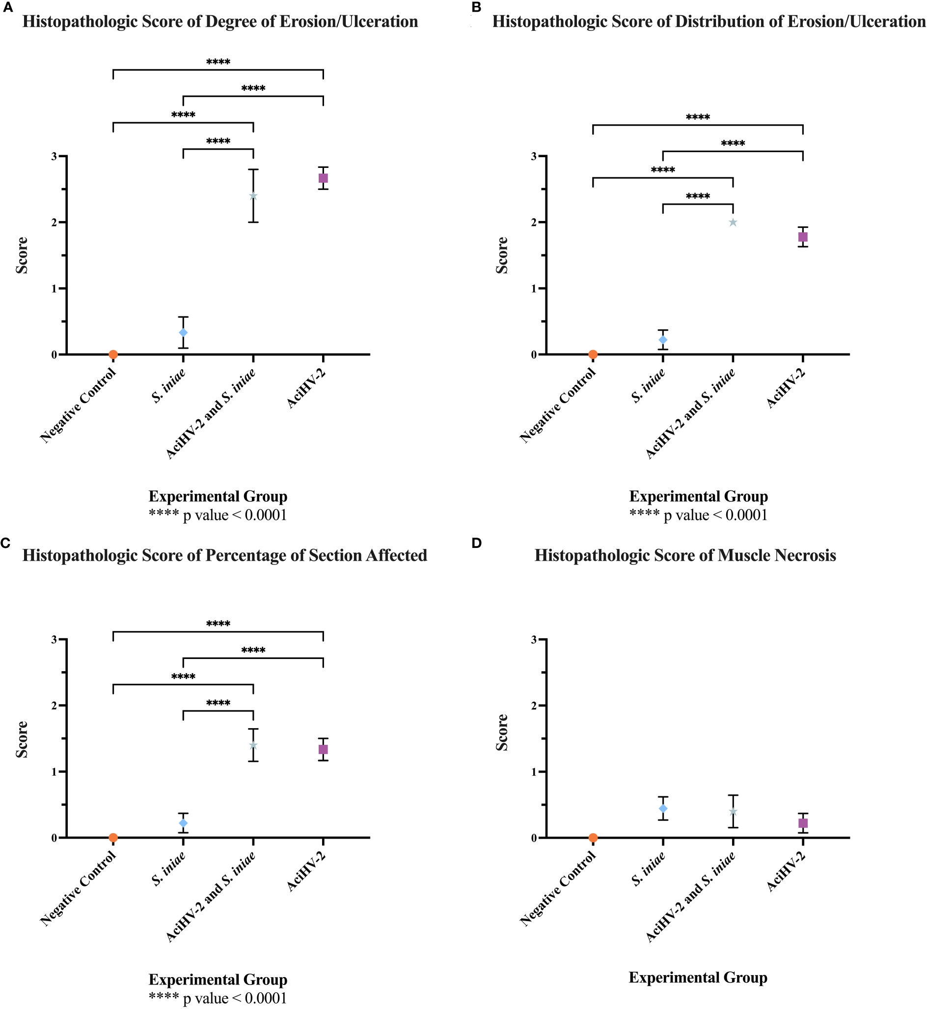 Histopathologic evaluation of tissues from mortalities of the co-infection challenge. An immersion challenge model was performed by exposing white sturgeon fingerlings to a 5.96x102 TCID50/mL Acipenserid herpesvirus 2 (AciHV-2) bath or a sterile cell culture media bath for 1 hour. Survivors of this challenge at 44 days were re-sorted into groups of 60 fish (triplicates of 20 fish) per treatment. Fish received either 106 CFU of S. iniae or sterile Phosphate Buffered Saline in the epaxial musculature. Mortality was monitored for 28 days after injection and at least 5 mortalities from each challenged group (S. iniae group and AciHV-2 group: n = 9 each; co-infection group: n = 5) were submitted for histopathologic analysis. The negative control representatives (n = 10) were submitted as euthanized survivors at the end of the study. (A) The “degree of erosion/ulceration” category was scored from 0-3 per slide where 0 represented no erosion or ulceration, 1 represented loss of superficial epithelial cells (erosion), 2 represented loss of epidermis/mucosal epithelium (ulceration), and 3 represented loss of dermis/underlying connective tissue. (B) The “distribution of erosion/ulceration” category was scored from 1-2 per slide where 0 represented no erosion or ulceration, 1 represented focal erosion or ulceration, and 2 represented multifocal erosion or ulceration. (C) The “percentage of section affected” category was scored from 0-4 per slide where 0 represented no erosion or ulceration, 1 represented less than 25% of the section affected, 2 represented between 25% and 50% of the section affected, 3 represented between 51% and 75% of the section affected, and 4 represented more than 75% of the section affected. (D) The “muscle necrosis” category was scored from 0-1 per slide where 0 represented no muscle necrosis present, and 1 represented muscle necrosis present. Results reveal that the degree of, distribution of, and percentage of section affected with erosion/ulceration appears to be driven by the AciHV-2 infection. In addition, none of the infected groups had significant muscle necrosis present in the sections analyzed. Values represent mean with standard error of the mean plotted.