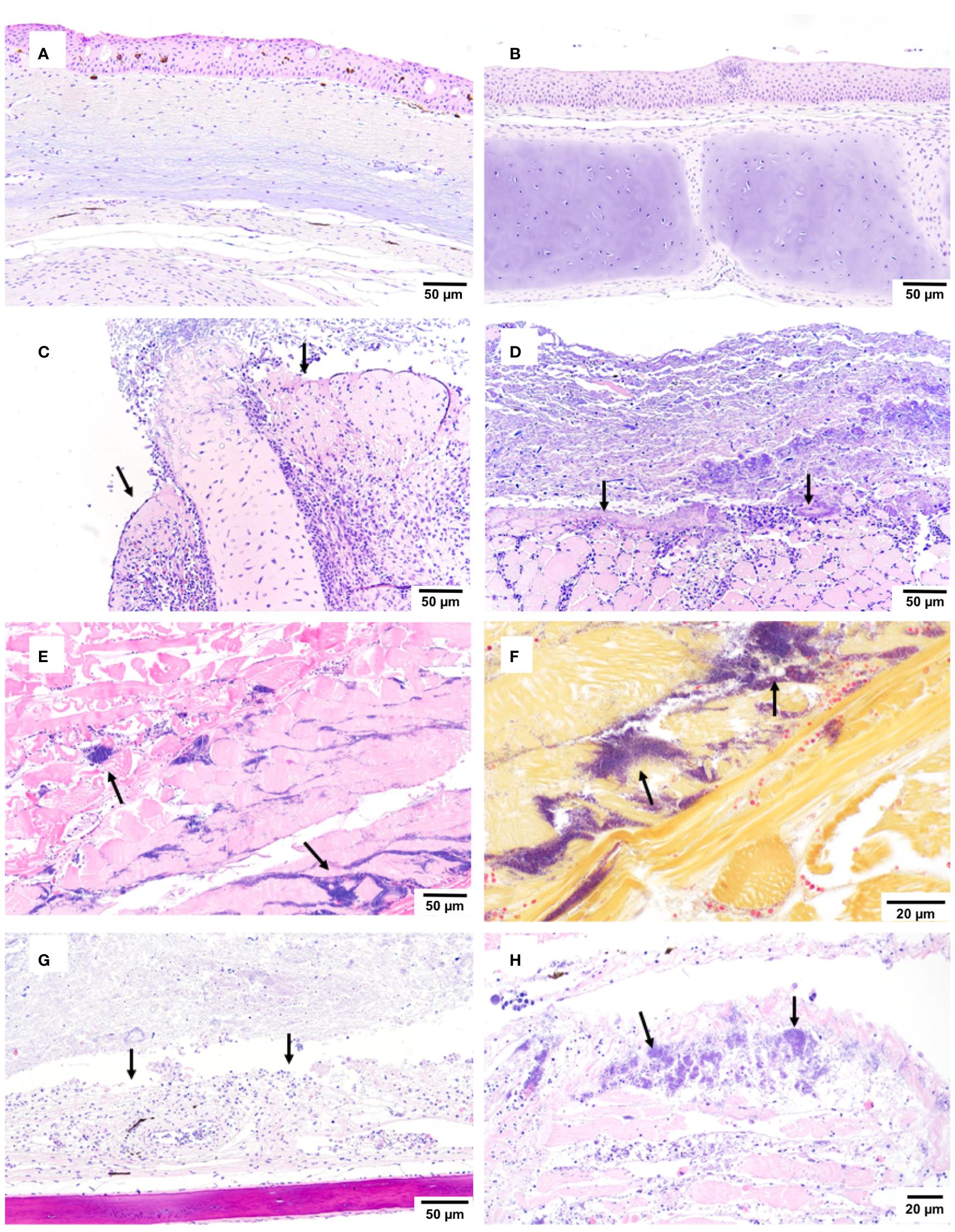 Histopathological findings during co-infection challenge. An immersion challenge model was performed by exposing white sturgeon fingerlings to a 5.96x102 TCID50/mL Acipenserid herpesvirus 2 (AciHV-2) bath or a sterile cell culture media bath for 1 hour. Survivors of this challenge at 44 days were re-sorted into groups of 60 fish (triplicates of 20 fish) per treatment. Fish received either 106 CFU of S. iniae or sterile Phosphate Buffered Saline in the epaxial musculature. Mortality was monitored for 28 days after injection and at least 5 mortalities from each challenged group (S. iniae group and AciHV-2 group: n = 9 each; co-infection group: n = 5) were submitted for histopathologic analysis. The negative control representatives (n = 10) were submitted as euthanized survivors at the end of the study. (A, B) the negative control showed no overt pathology (H&E). (C, D) the AciHV-2 group showed ulceration - loss of epithelium, and exposure of underlying connective tissue/cartilage (C) or skeletal muscle (D) with secondary oomycete (C) or bacterial (D) colonization (H&E). (E) the S. iniae group showed regionally extensive rhabdomyonecrosis with large numbers of intralesional coccoid bacteria (H&E). (F) the S. iniae group showed regionally extensive rhabdomyonecrosis with large numbers of intralesional Gram-positive bacteria (Gram stain). (G) the co-infection group showed ulceration - loss of epidermis, and exposure of underlying connective tissue/cartilage with secondary colonization by bacteria (H&E). (H) the co-infection group showed regionally extensive rhabdomyonecrosis with large numbers of intralesional coccoid bacteria (H&E). The black arrows point towards the lesions described.