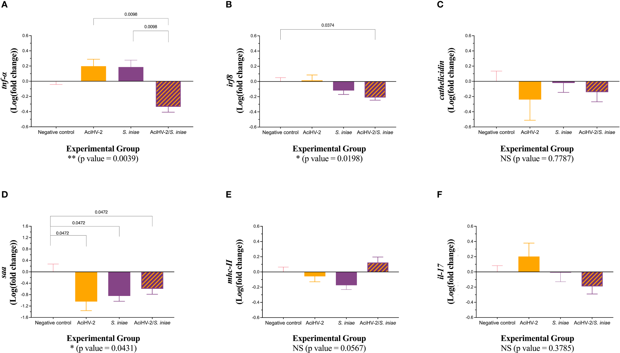 Gene expression at 15 days post co-infection challenge. An immersion challenge model was performed by exposing white sturgeon fingerlings to a 5.96x102 TCID50/mL bath or a sterile cell culture media bath for 1 hour. Survivors of this challenge at 44 days were re-sorted into groups of 60 fish (triplicates of 20 fish) per treatment. Fish received either 106 CFU of S. iniae or sterile Phosphate Buffered Saline in the epaxial musculature. Mortality was monitored for 28 days after injection. Two fish per tank (six fish per group) were euthanized at 15 days post-injection and spleens were collected for reverse transcription quantitative polymerase chain reaction (RT-qPCR) of important players in the immune response, using elongation factor and beta-actin as housekeeping genes. Results are plotted as the mean and standard error of the mean. Results reveal a statistically significant transcriptional downregulation of tumor necrosis factor alpha (tnfα - A) in the coinfection group compared to the single pathogen groups, as well as some differential transcription of interferon regulatory factor 8 (irf8 - B) and serum amyloid a (saa - D) when compared to the negative control. A is for tumor necrosis factor alpha, B is for interferon regulatory factor 8, C is for cathelicidin, D is for serum amyloid A, E is for major histocompatibility complex II, and F is for interleukin 17.
