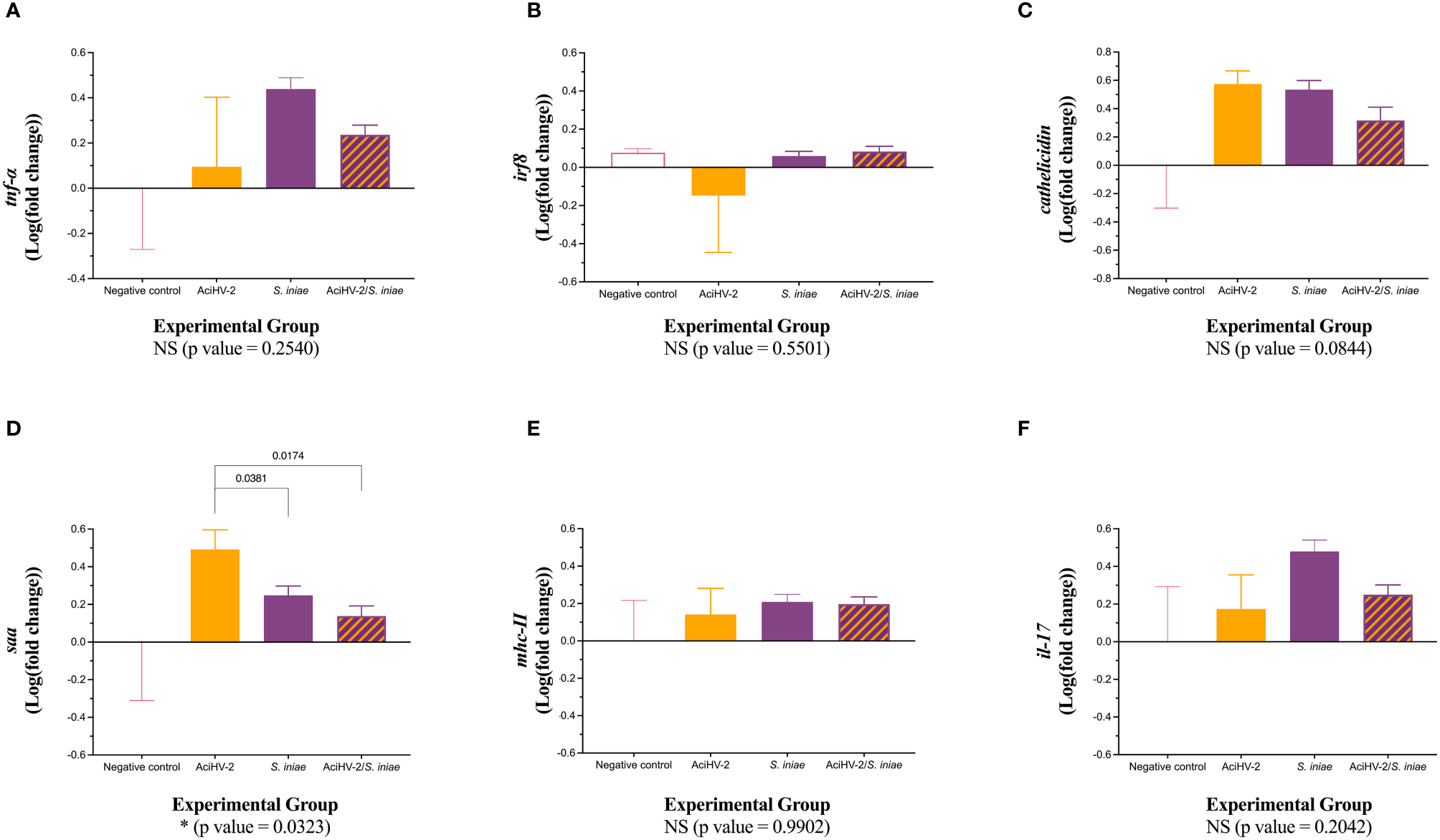 Gene expression at 28 days post co-infection challenge. An immersion challenge model was performed by exposing white sturgeon fingerlings to a 5.96x102 TCID50/mL bath or a sterile cell culture media bath for 1 hour. Survivors of this challenge at 44 days were re-sorted into groups of 60 fish (triplicates of 20 fish) per treatment. Fish received either 106 CFU of S. iniae or sterile Phosphate Buffered Saline in the epaxial musculature. Mortality was monitored for 28 days after injection. Ten fish per group were euthanized at 28 days post-injection and spleens were collected for reverse transcription quantitative polymerase chain reaction (RT-qPCR) of important players in the immune response, using elongation factor and beta actin as housekeeping genes. Results are plotted as the mean and standard error of the mean. Results reveal a statistically significant transcriptional downregulation of serum amyloid a (saa - D) in the groups infected with bacteria when compared to the AciHV-2 group. A is for tumor necrosis factor alpha, B is for interferon regulatory factor 8, C is for cathelicidin, D is for serum amyloid A, E is for major histocompatibility complex II, and F is for interleukin 17.