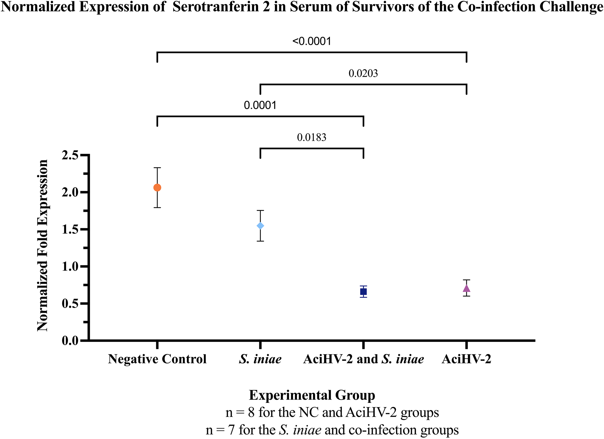 Detection of Serum Serotransferrin in Survivors of Co-infection Challenge. An immersion challenge model was performed by exposing white sturgeon fingerlings to a 5.96x102 TCID50/mL bath or a sterile cell culture media bath for 1 hour. Survivors of this challenge at 44 days were re-sorted into groups of 60 fish (triplicates of 20 fish) per treatment. Fish received either 106 CFU of S. iniae or sterile Phosphate Buffered Saline in the epaxial musculature. Mortality was monitored for 28 days after injection and whole blood was collected from the caudal vein of 10 survivors per group. Serum was obtained from the whole blood samples and Western Blotting was performed to identify Serotransferrin 2 (STF-2) in the samples. The solid shapes represent the mean normalized fold expression, with standard error the mean plotted. The p values calculated between groups are stated in each comparison bracket. Results reveal that the co-infection and AciHV-2 groups had a statistically significant decrease in serum STF-2 levels compared to the group that received S. iniae alone and the negative control.
