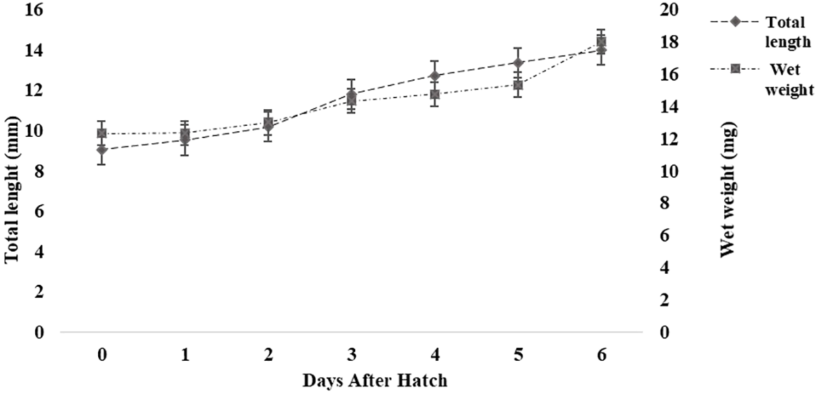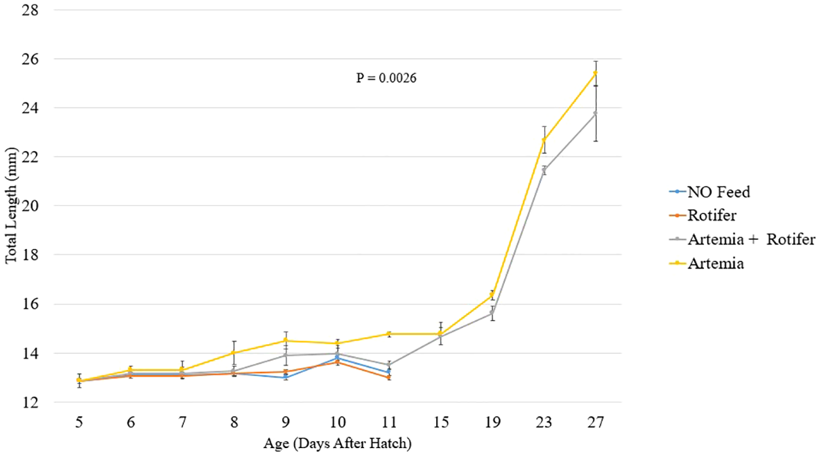 Figure 2 depicts the length increase over time for each treatment. Fry fed with Artemia and fry co-fed survived and grew until the end of the trial at 27 DAH (Figure 2). The highest recorded total length of 25.4 ± 0.5 mm was observed in the group fed with Artemia. Fry reared without food and those provided with rotifers died between 8 and 11 DAH.