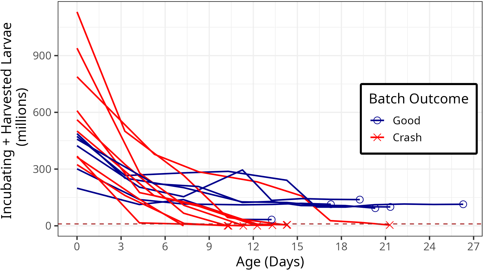 Survivorship curves for the batches of larvae sampled in this experiment. The x-axis shows the age of the larvae in days, and the y axis shows the number of larvae incubating in tanks, plus the number of pediveliger larvae harvested for planting or other purposes. Red curves indicate batches in which there were fewer than ten million larvae that survived to harvest. The dashed brown line indicates ten million larvae.