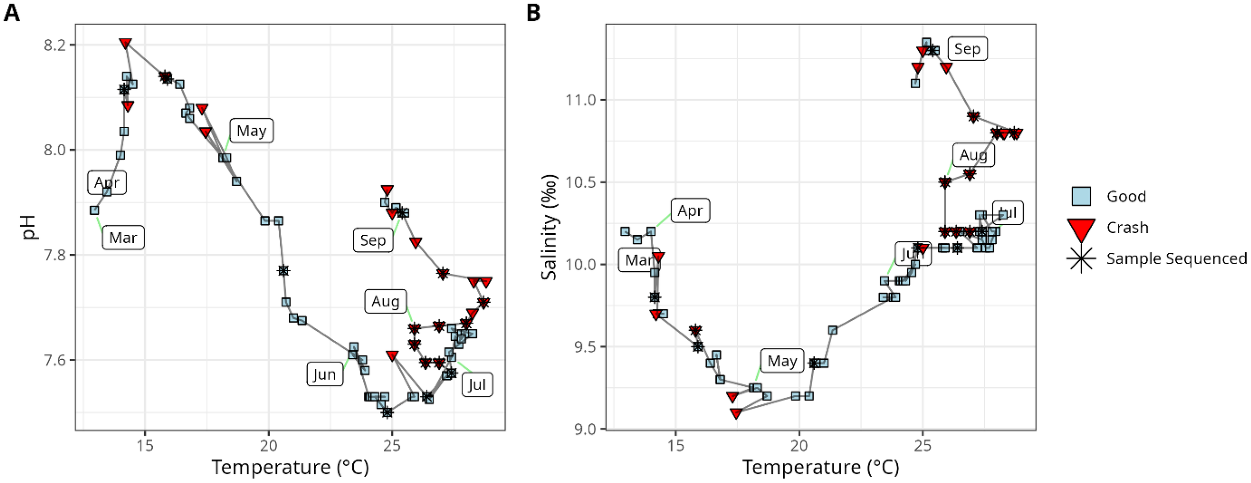 Properties of hatchery intake water and how they varied over time, including pH, Temperature (A) and Salinity (B). The first timepoint collected each month is labeled with a rounded rectangle. Sample shapes and colors indicate whether a crash occurred at each time-point. Stars indicate the samples that were sequenced in this study.