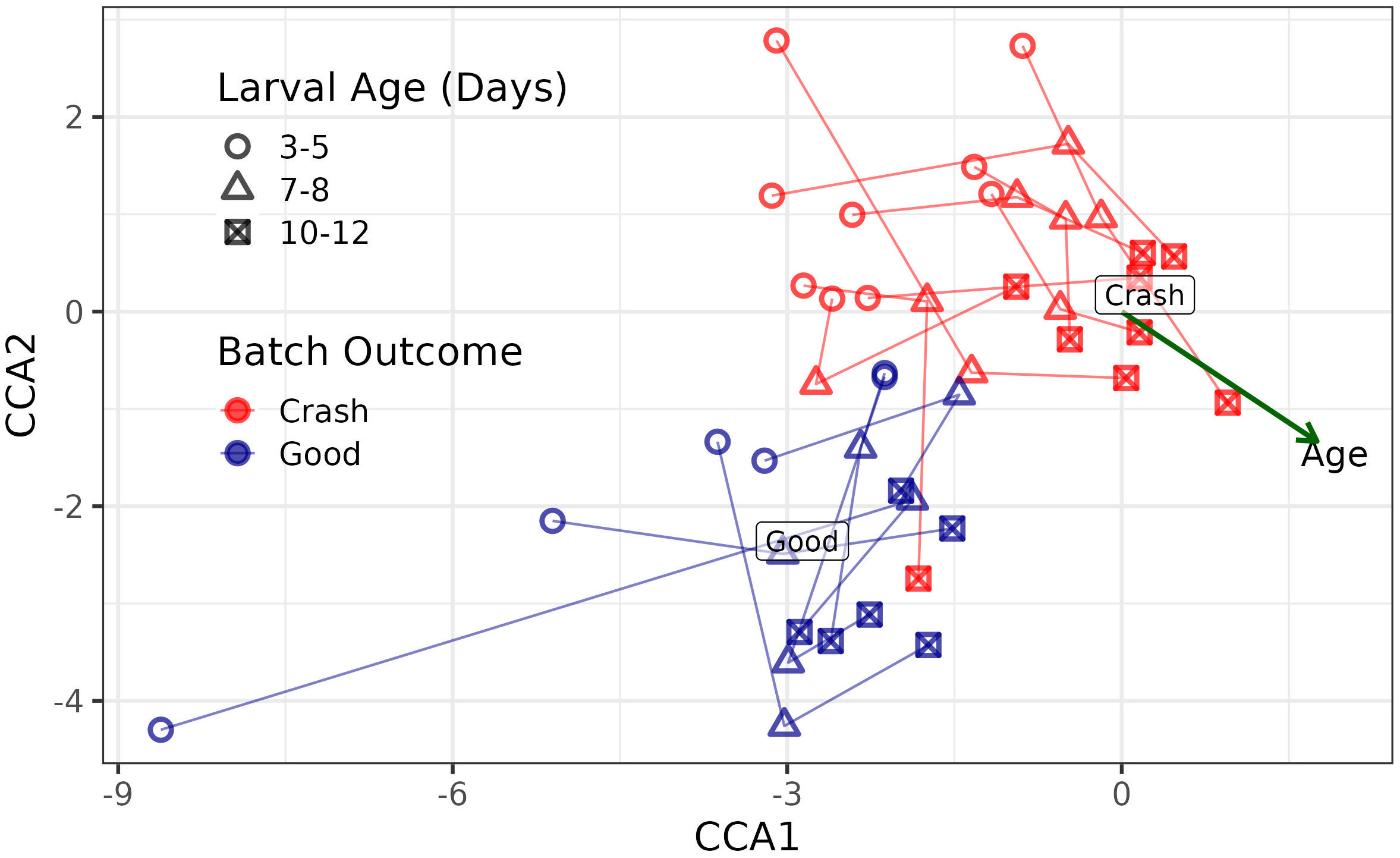 Canonical correspondence analysis showing the progression of the microbial community, aggregated to the family level, across 15 distinct larval hatchery batches. Points that are closer together indicate samples with more similar microbial communities. Shape indicates larval age while color indicates batch performance (crash vs good).