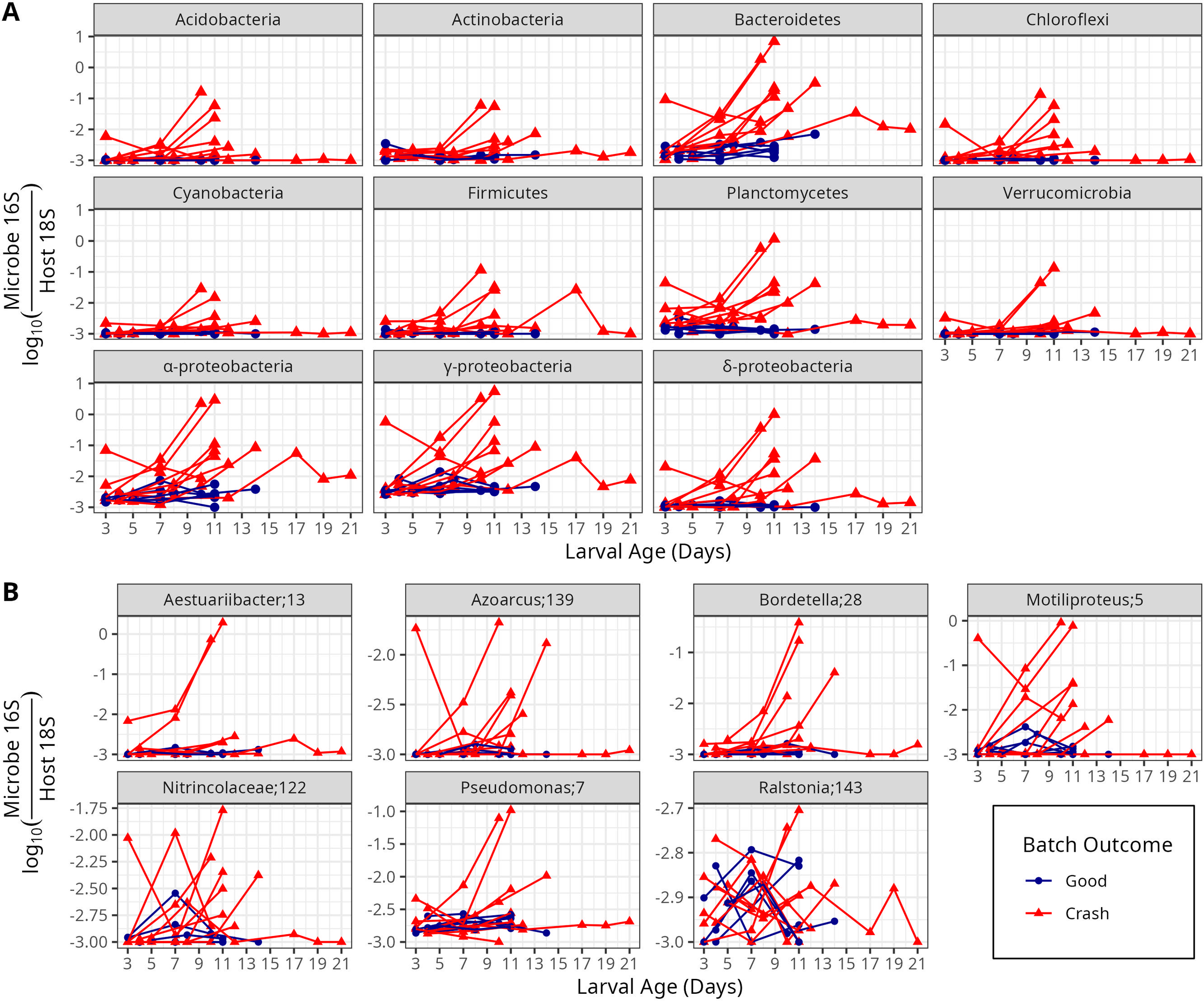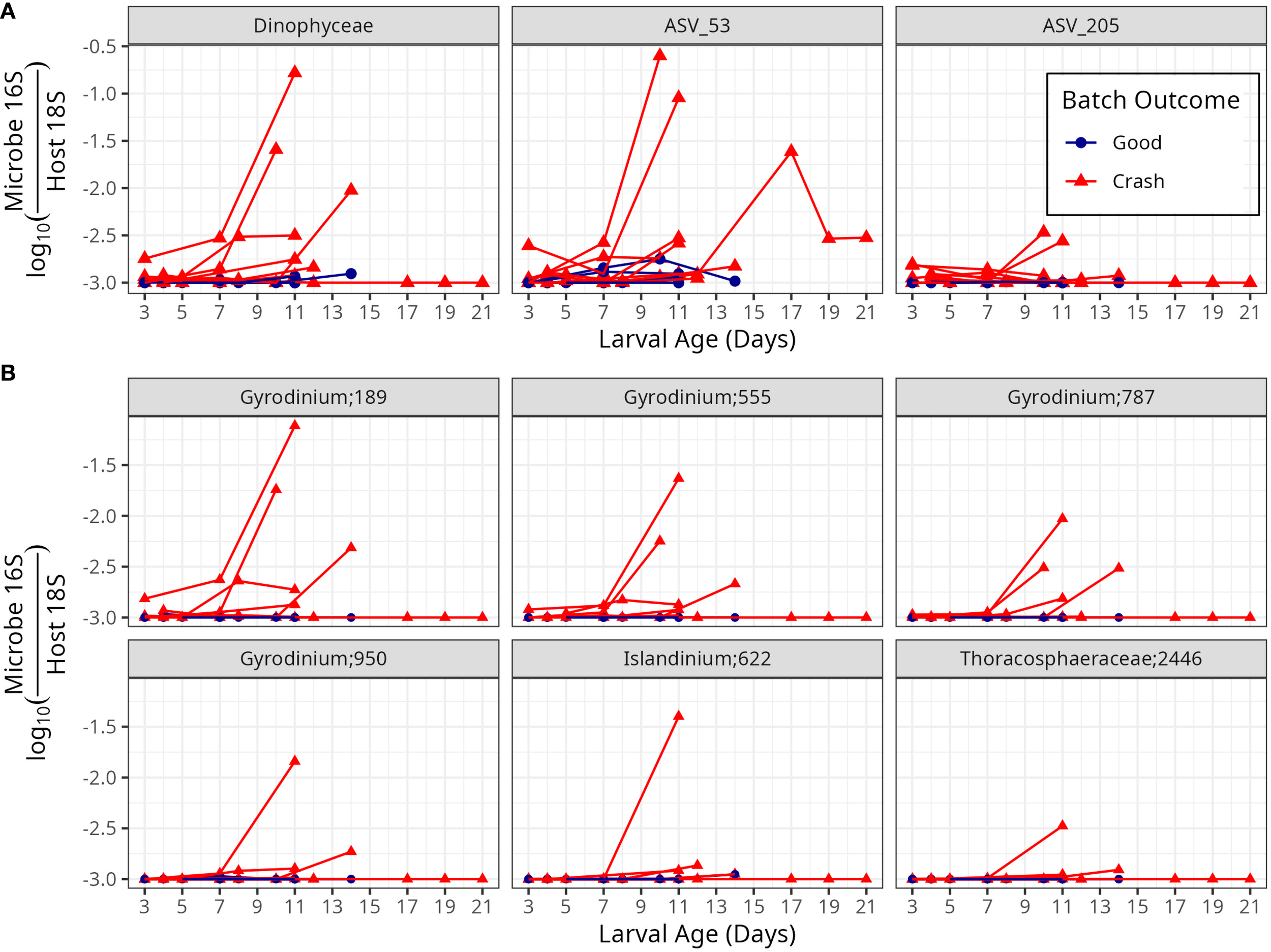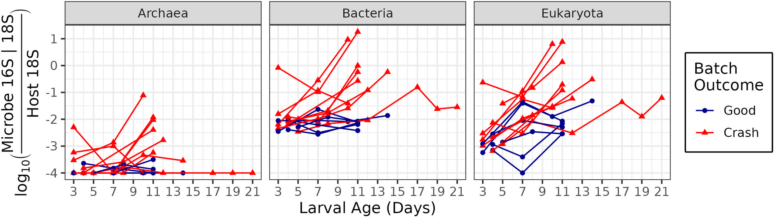 Microbe to host gene ratios of microbial domains. The x-axis indicates larval age, measured in days since fertilization. The y-axis indicates the log of the ratio of microbial 16S or 18S genes to host 18S genes. Higher values correspond to greater microbial loading on hosts. Color and point shape indicate whether the batch experienced a crash (with fewer than 1 million larvae surviving to harvest), or did not experience a crash.