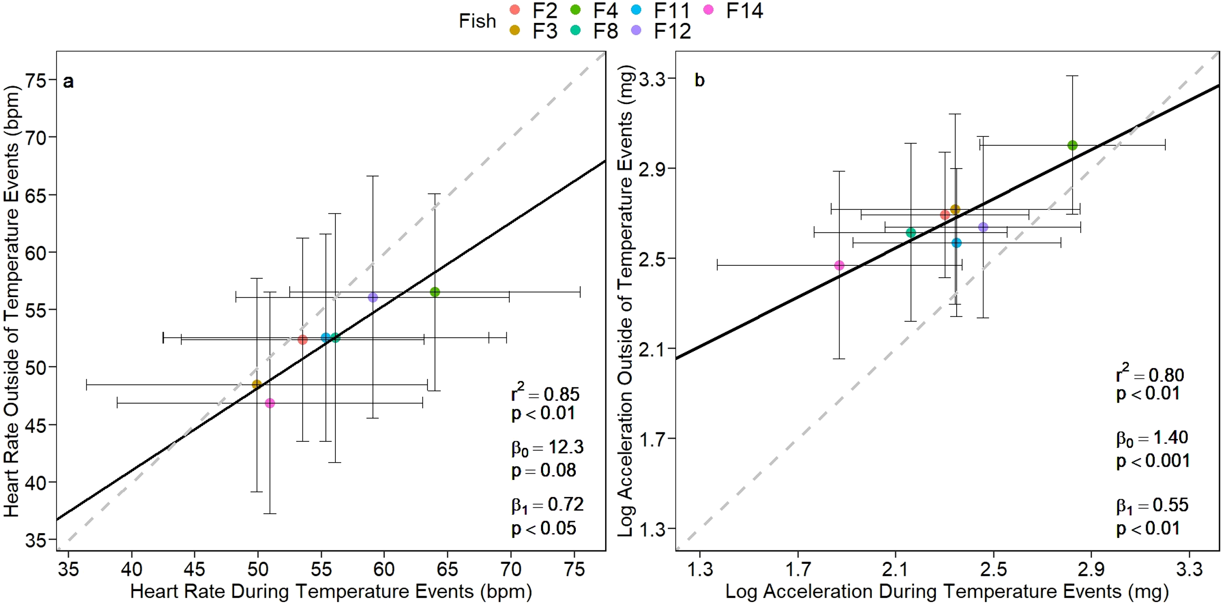 A general comparison between the average heart rate of individual fish during the periods with heat events and the rest of the study period revealed a positive linear relationship (r2 = 0.85, p < 0.01, Figure 2A), suggesting that variation between individual responses persists under the effect of thermal events. The linear relationship between the heart rate of individuals under both conditions revealed that the slope was significantly lower than 1 (p < 0.05), but the intercept was not significantly different than 0 (p = 0.08). This suggests that individuals with naturally higher heart rate could be restricted in their capacity to proportionally increase heart rate in response to thermal stress, in contrast to those with naturally lower heart rates. The same comparison between log-transformed average external acceleration during heat events and the rest of the study period was carried out and revealed a similar positive relationship (r2 = 0.80, Figure 2B). The slope of the linear relationship between the log-transformed acceleration of individuals was significantly lower than 1 (p < 0.001) and, the intercept was also statistically different than 0 (p < 0.01), suggesting that fish activity was consistently higher under normal conditions than under thermal stress but the change in activity was not proportional to normal conditions across individuals.