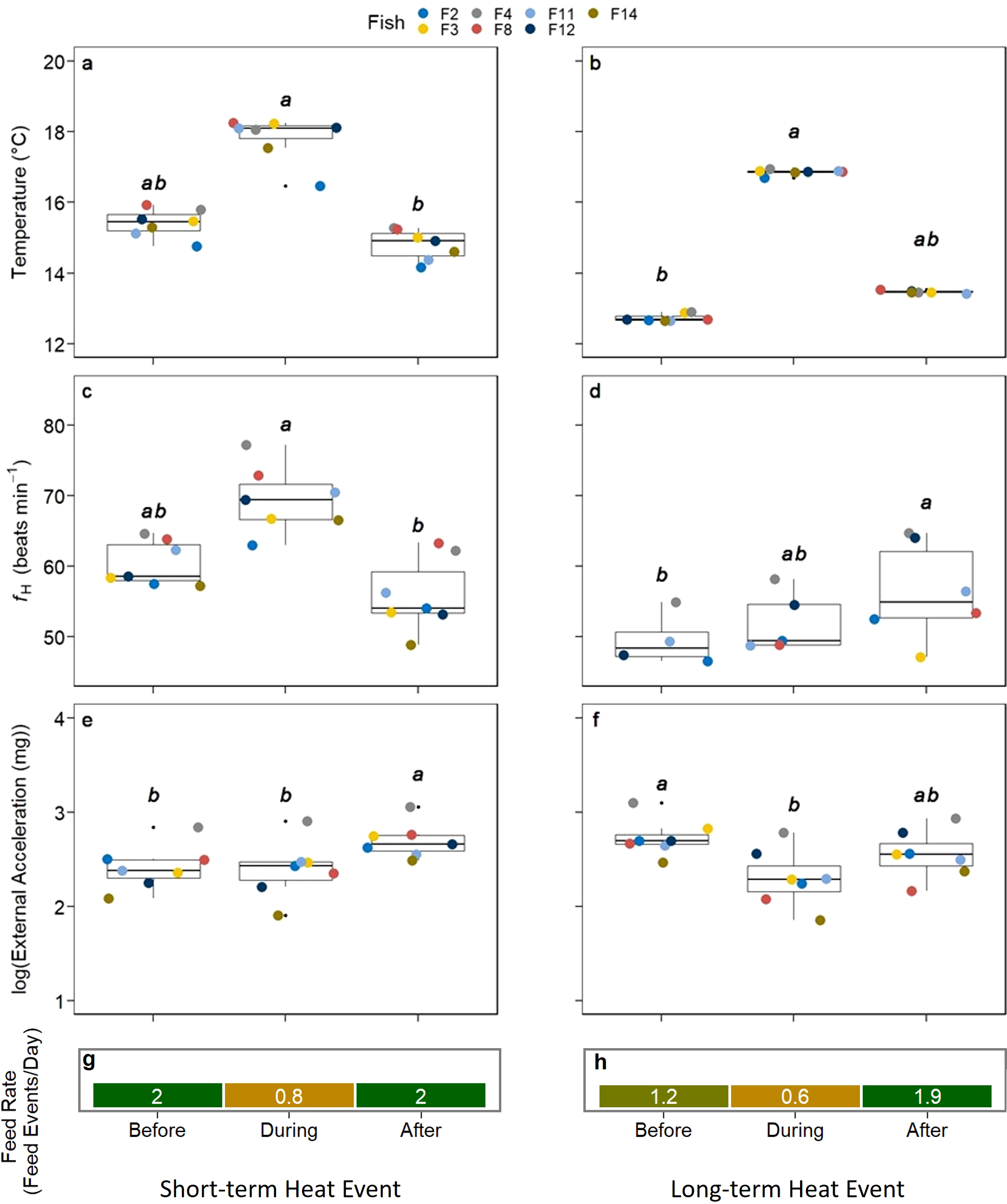 Comparison of fish observations before, during and after a short- and long-term heat event. Coloured points indicate the individual fish average. All comparisons were made with the Friedman test and post-hoc analysis was done using the Nemenyi test. Significant differences are indicated by lowercase lettering. All comparisons were made between the three periods before, during, and after (A) STHE temperature [°C] (B) LTHE temperature [°C]. (C) STHE fH [bpm] (D) LTHE fH [bpm]. (E) STHE log-transformed external acceleration [mg] (F) LTHE log-transformed external acceleration [mg] (G) STHE feed rate [feed events/day] (H) LTHE feed rate [feed events/day].
