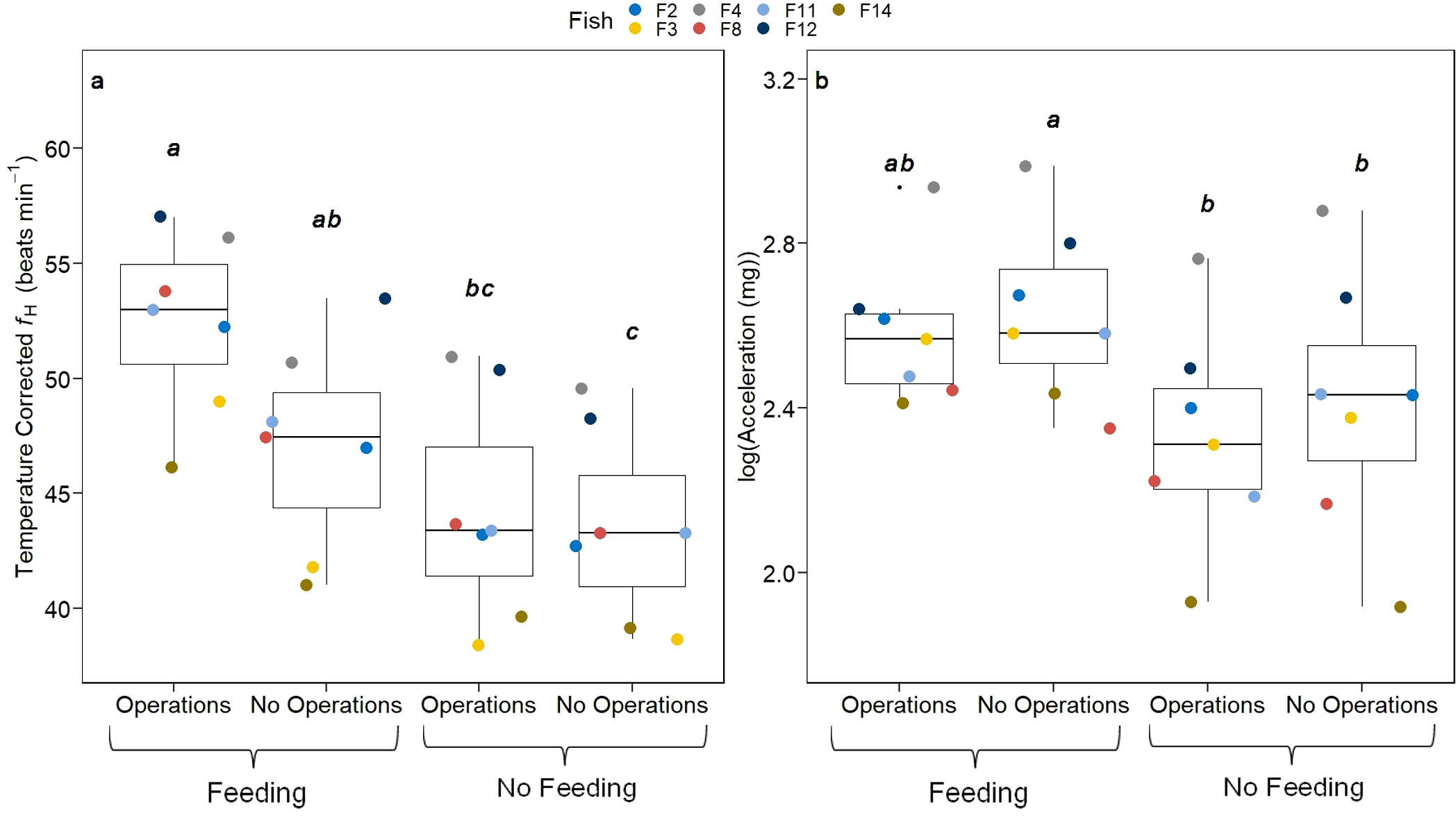 Comparison of fish observations between all combinations of when operations and feeding events are and are not occurring. Coloured points indicate the individual fish averages. All comparisons were made with the Friedman test and post-hoc analysis was done using the Nemenyi test. Significant differences among groups are presented by lowercase lettering. (A)fH [bpm] (B) Log-transformed external acceleration [mg].