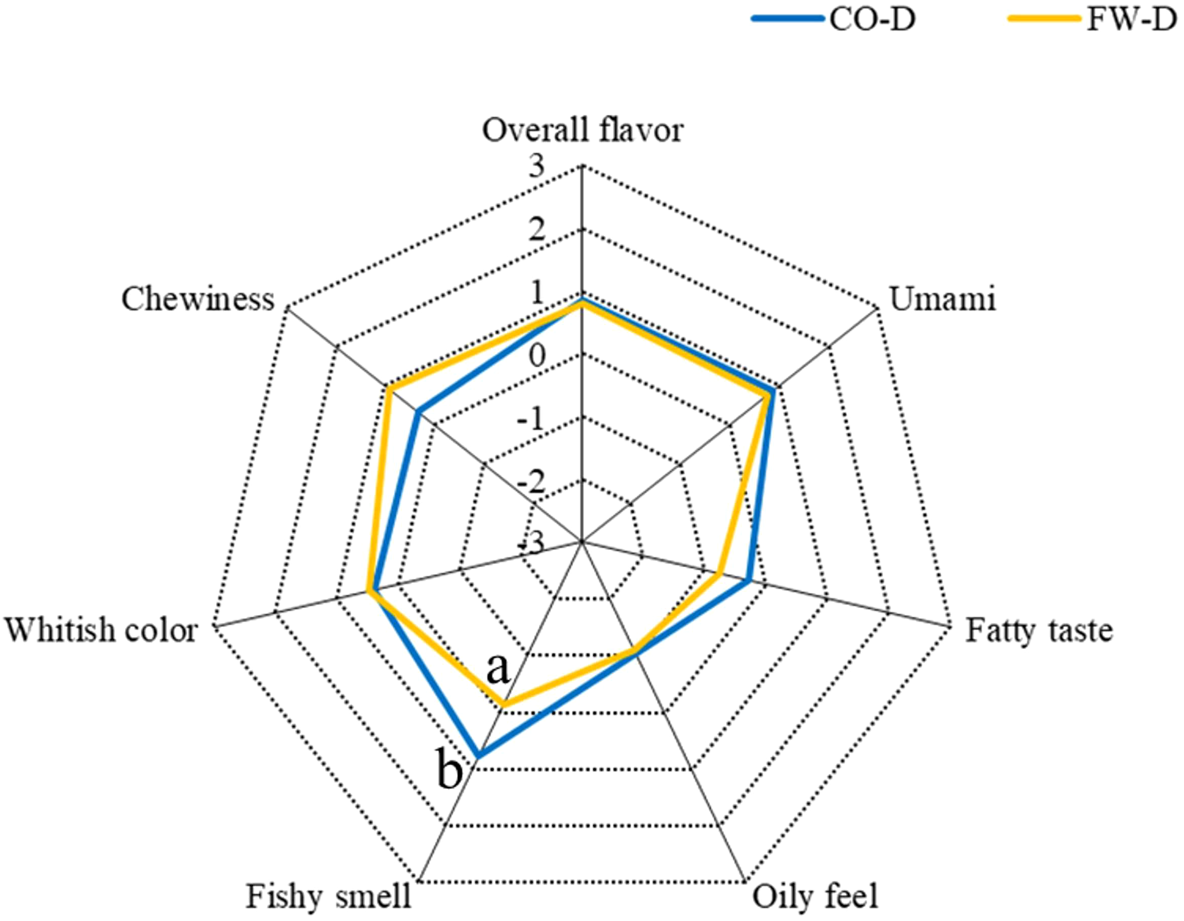 Sensory evaluation of the fish muscles (CO-D and FW-D groups) was conducted according to the procedure described by Hu et al. (2013). The panel consisted of 10 males and 11 females aged 20–50 years belonging to the University of the Ryukyus (Okinawa, Japan), and they were individuals with prior experience in sensory evaluation of fish, having participated in multiple similar assessments in previous studies. The evaluation trial was conducted at 25 ± 2°C in the sensory laboratory at the University. The fish fillets (4 cm × 8 cm × 1 cm) were heated with microwave (980 W) for 90 s and used in this trial. Assessments of food taste was divided into the following seven categories: umami, fatty taste, oily feel, fishy smell, whitish color, chewiness, and overall flavor. Each panel gave each selected attribute, with a 7-point score (from −3 = “slightly applicable” to +3 = “very applicable”) for each category according to the taste of the heated fish muscle.