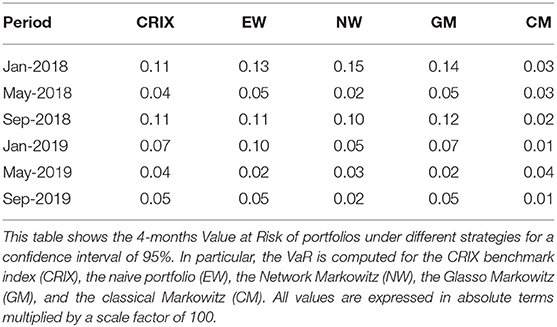 In Table 3 we compute the 4-months Value at Risk (VaR) with a confidence level of 0.05% for the benchmark index (CRIX), the equally weighted portfolio, our Network Markowitz portfolio, the Glasso Markowitz and the traditional Markowitz portfolios. This is done in order to compare, together with cumulative returns, the potential riskiness of our strategy with respect to the alternative portfolio allocation methods considered.