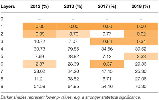 As these tables show, including information from the deeper layers in the algorithm does improve the prediction, compared to the upper-most layer alone (e.g., layer 0). However, the additional improvement in prediction accuracy decreases with layer depth. For instance, the inclusion of information from layer 2, when compared to layer 1, yields substantially smaller improvements than the inclusion of layer 1, when compared to layer 0. Furthermore, we see far less statistically significant values as layer depth increases.