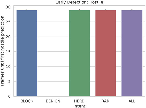 As seen in Figure 5, the classifier is able to consistently detect the primary behaviors less than fifty frames into the scenario, which has a total of 1,000 frames. The minimum possible early detection is 29 because l_wdw = 30. Considering this delay in the potential predictions, the algorithm is able to predict BLOCK, BENIGN, and HERD behaviors within 10 frames and RAM behaviors within 20 frames, on average. This is particularly important since each of the behaviors are time extended processes with significant overlap with respect to their observable symbols, as described below.