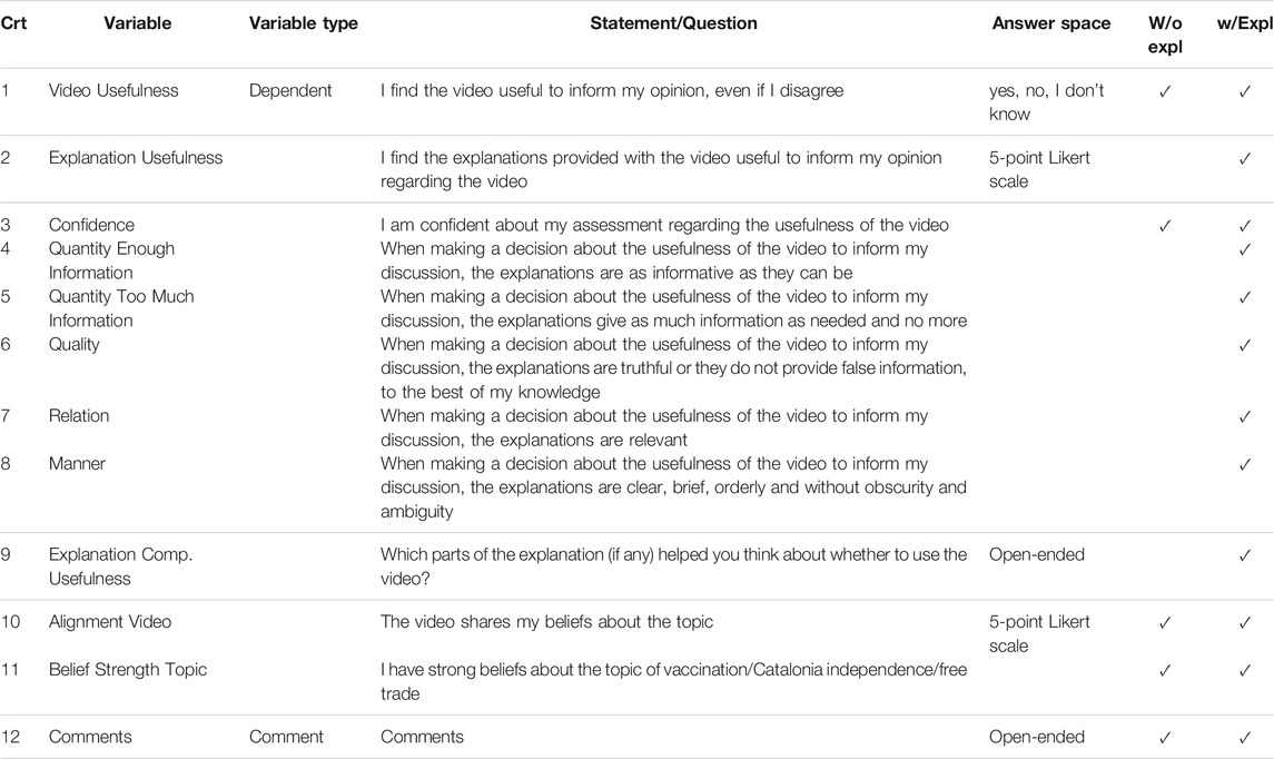 In the condition w/o explanations, participants were first required to watch the video until the end, and then rate the video based on the following criteria: video usefulness and confidence, alignment on the video and belief strength on the topic. In the condition w/explanations, the participants were first required to watch the entire video. The explanations were only shown to them after watching the entire video. Then, participants were asked to rate a set of criteria regarding the video and the explanations. To avoid priming and maintain a controlled setup, we do not provide the explanations (simultaneously) with the video. We want the participants to pay attention to the information presented (video and explanation, respectively). Showing them both at once creates a competition for their attention. In addition to the four criteria from the condition w/o explanations, the participants had to rate the explanation usefulness and its quality based on the cooperative principles introduced by Grice (1975) (see Section 5.5). Then, participants moved to a second page, which contained the explanations. We asked participants, in a free text field, to tell us which parts of the explanations, if any, helped them reason about the usefulness of the video. According to Verpoorten et al. (2012), such questions can also induce reflection in participants, by encouraging them to verbalize their experience. Participants could also leave comments at the end of the study (see Table 3).
