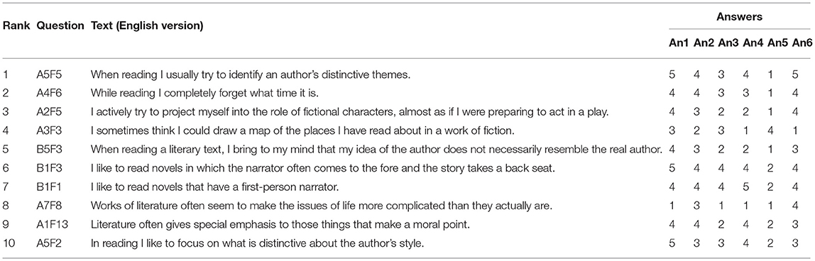 Since the focus of our research lies on German literature and our annotators are all German native speakers, we prepared part B of the questionnaire in German and also translated part A into German (the complete questionnaire is contained in the Supplementary Materials). The entire questionnaire consists of 14 thematically coherent groups of questions (A1,..., A7; B1,..., B7) and a group of filler questions (B8), with a total number of 94 questions. When the questionnaire was given to the annotators, questions appeared in randomised order; at first the questions from part A, followed by the questions from part B, but without letting the participants know when part B started. All answers are given on a Likert scale from 1 (“I totally disagree”) to 5 (“I fully agree”).