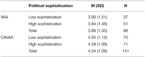 For evaluation of the (CA)VAA experience, results showed a significant main effect of VAA type [F (1, 225) = 19.56, p < 0.001, Cohen's d = 0.64]. As can be read from Table 1, the evaluation of the CAVAA experience was more positive compared to the experience of the regular VAA. There was no main effect of political sophistication [F (1, 225) = 0.04, p = 0.84], and also the interaction failed to reach significance [F (1, 225) = 0.07, p = 0.79].