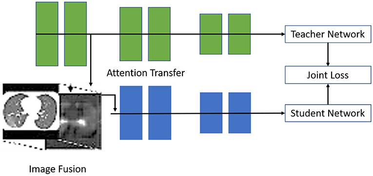 Further, knowledge passed from the teacher's network to the student's network will be used in the image fusion step to combine the original input with the attention information. Normally, the teacher network focuses on the global level features, whereas the student network focuses on learning from the local discriminative features. After this, the concluding experiment is conducted using openly available datasets such as X-Ray/CT Scan images. These experiments established the explainability of the proposed architecture for diagnosing COVID-19.