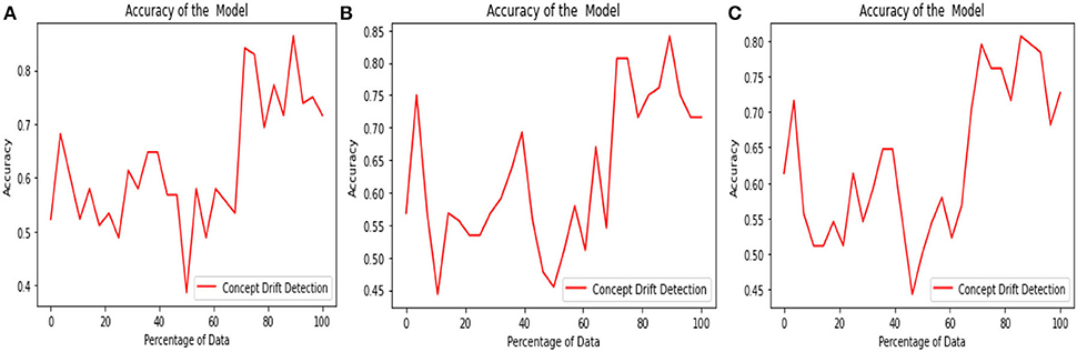The above Figures 6A–C diagrams depict the accuracy graph of the proposed concept drift detection technique for different hyperparameter values. The x-axis displays the percentage of data and the y-axis displays the accuracy. Whenever the accuracy of the model declines below 0.7 then concept drift will be signaled and the percentage of data will be added to the sliding window.