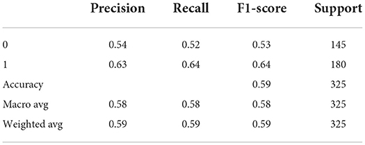 Table 6. Classification report for Figure 5C TP = 129, FN = 116, FP = 83, TN = 147.